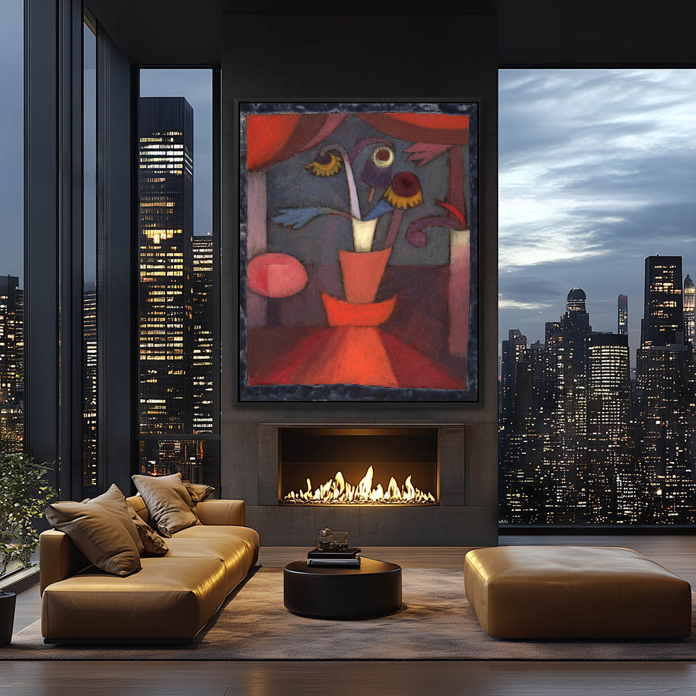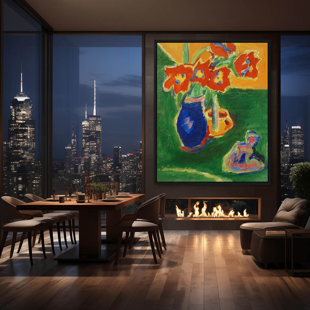 Red tulips in blue vase with sculpture