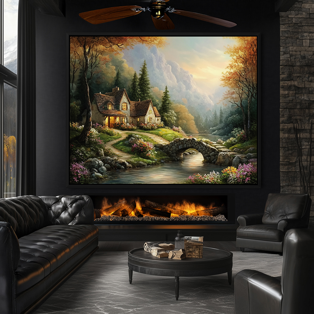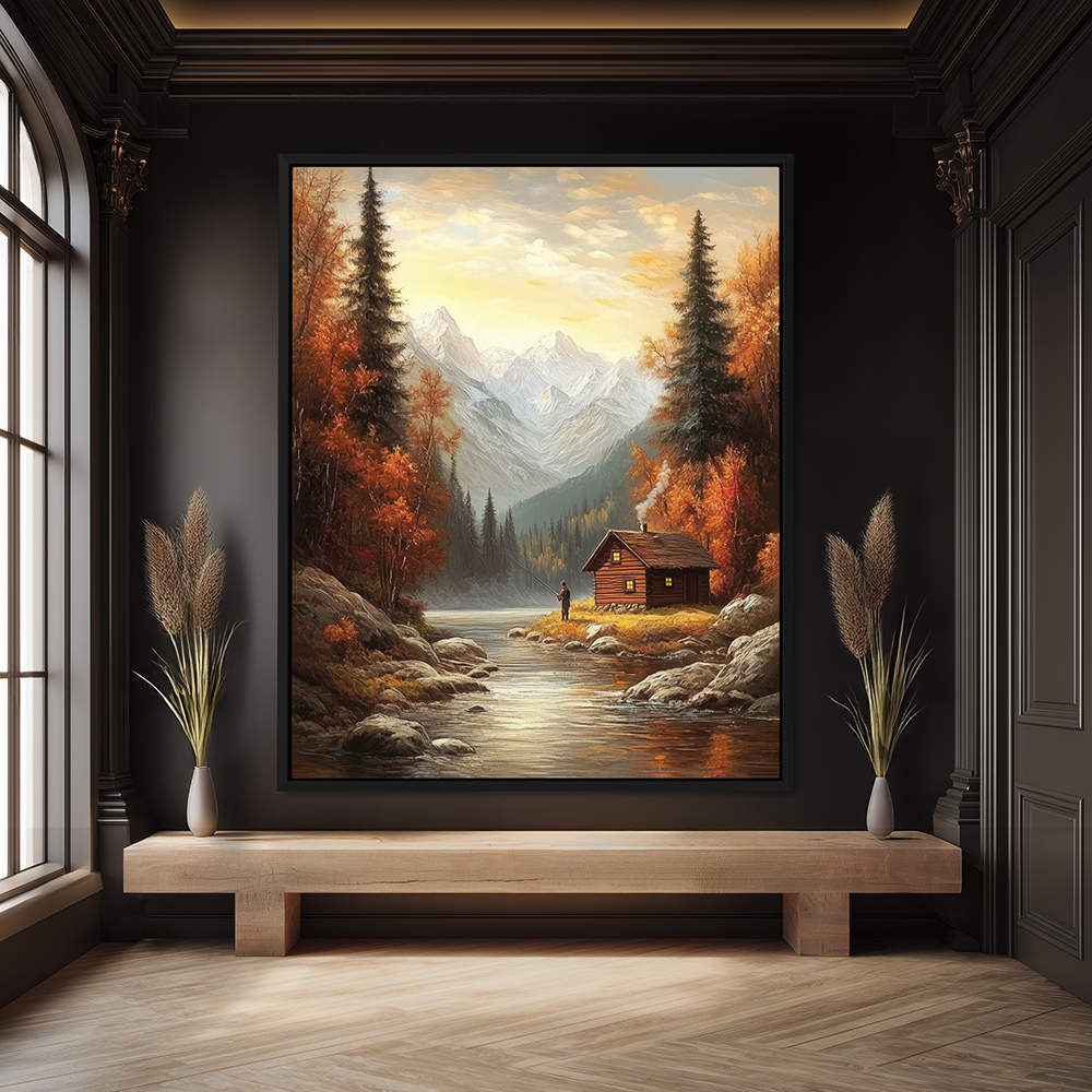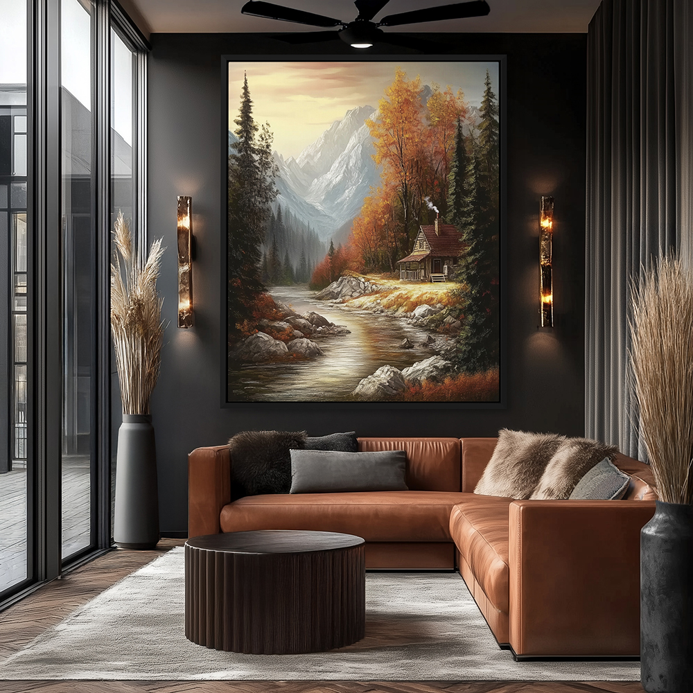 Wall Art Painting of a Cabin by a Mountain Stream