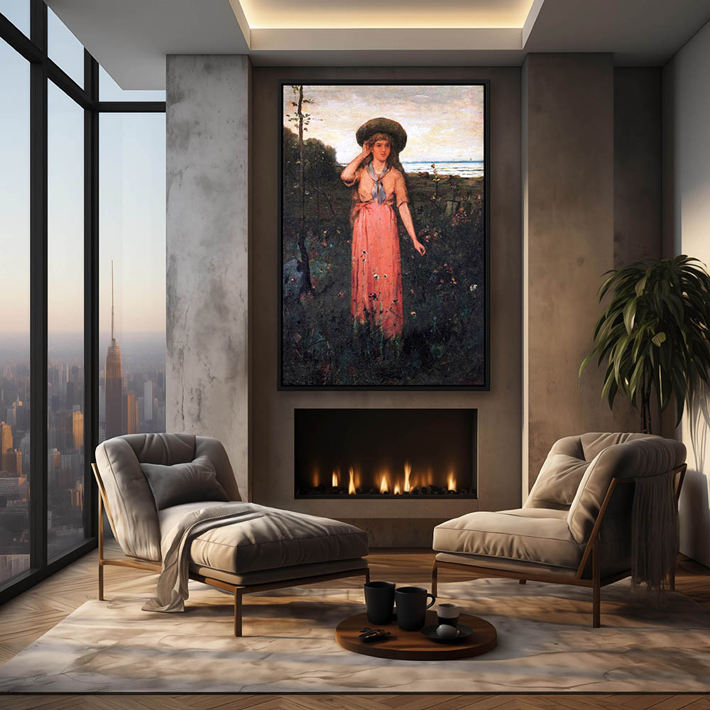 Vintage Figurative Painting of a Girl Picking Flowers by the Sea