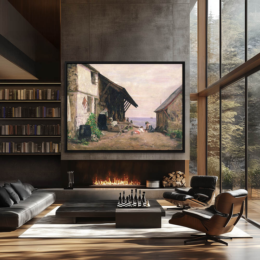 Vintage Landscape Coastal Paintiung with Kids Playing in Front of the House