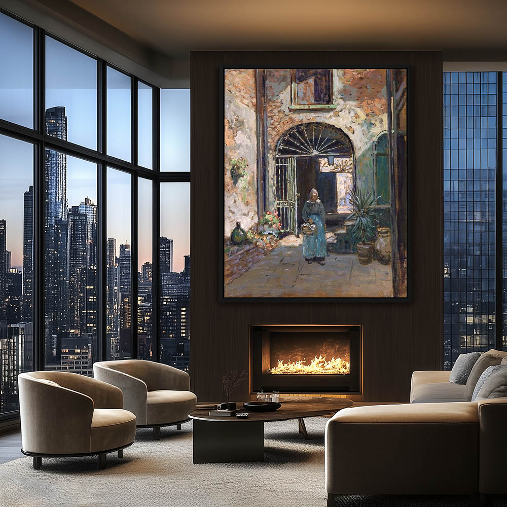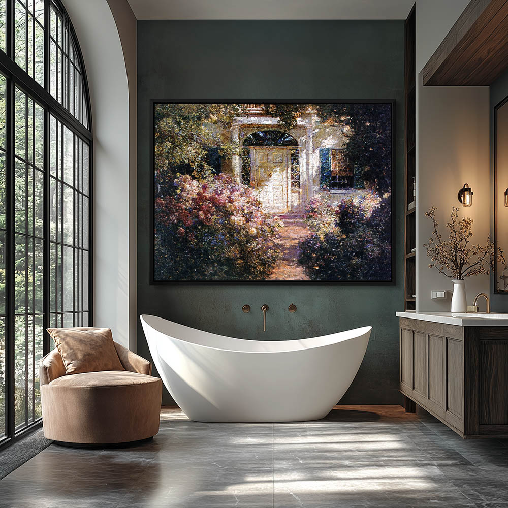 Vintage Landscape Flower Painting with a Doorway into the Garden