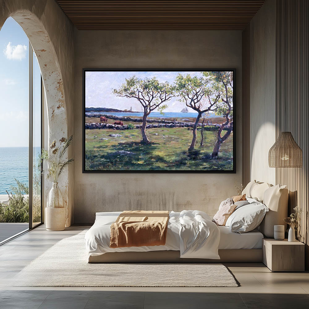 Vintage Coastal Painting with Cows Grazing and the Lighthouse and a Schooner in the Distance