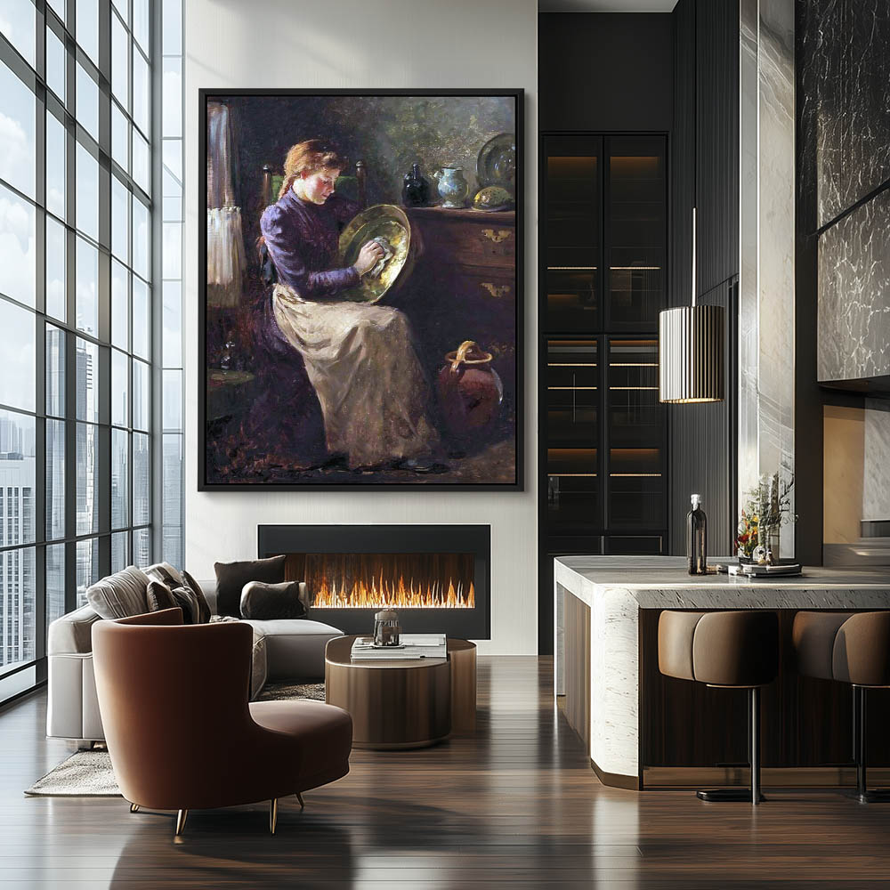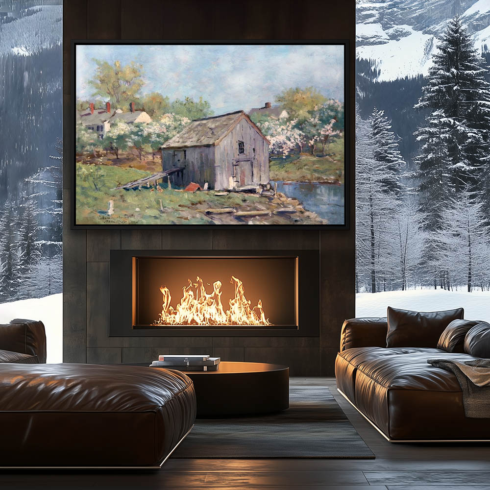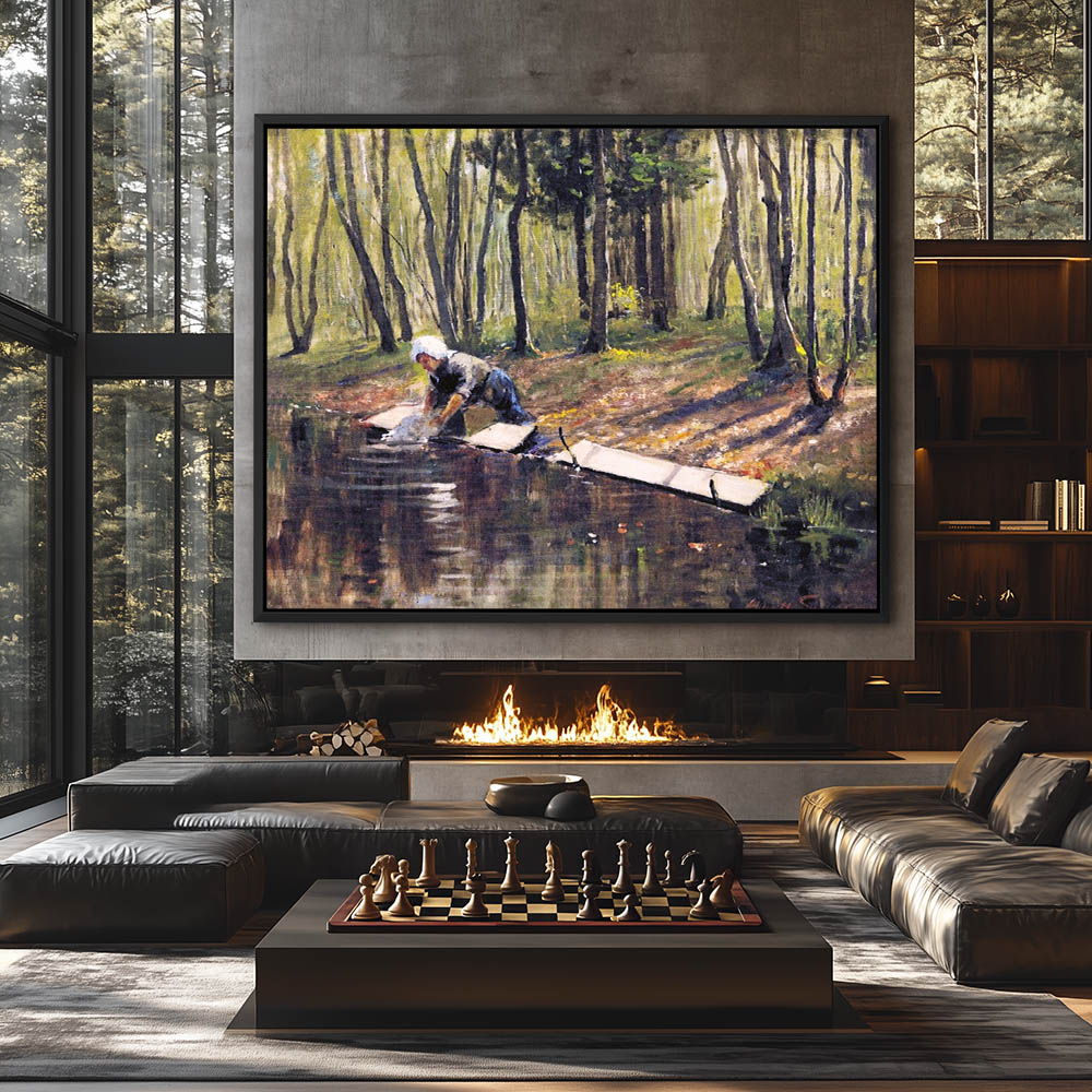 Vintage Landscape Painting with a Woman doing the Wash in the River