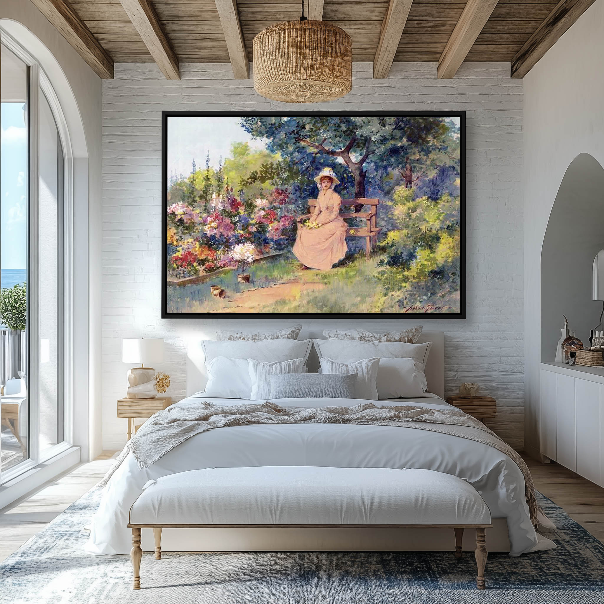 Vintage Landscape Painting with a Lady seated on a Bench in the Flower Garden