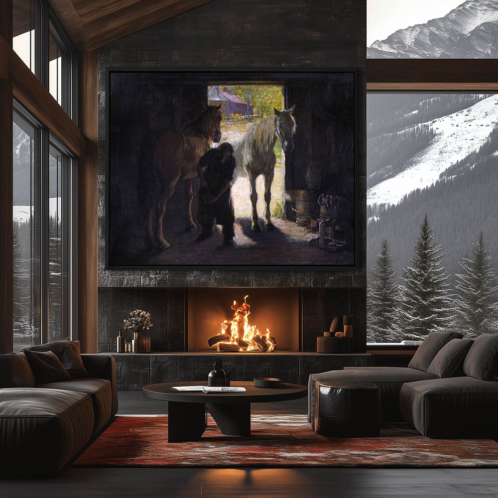 Vintage Figurative Animal Painting of a Ferrier Shoeing Horses