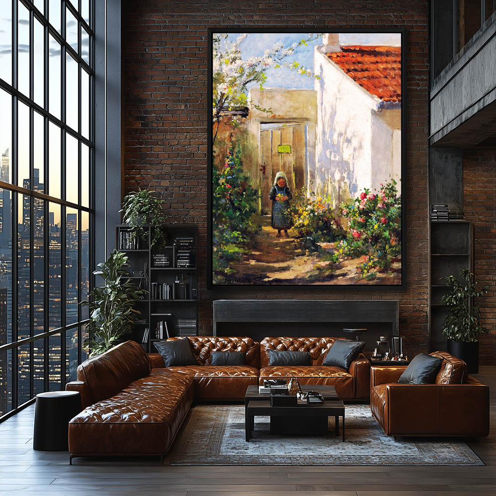 Vintage Landscape Flower Painting with a Child in the Summer Garden