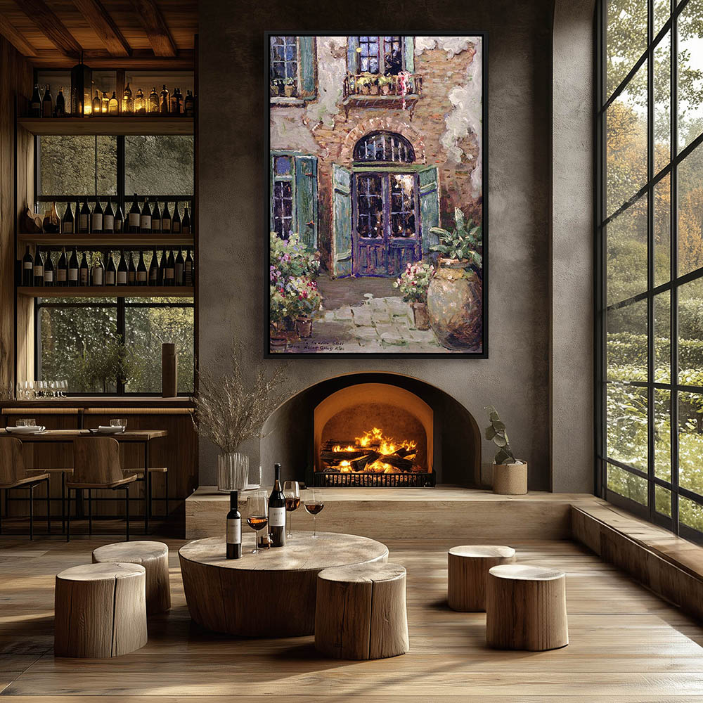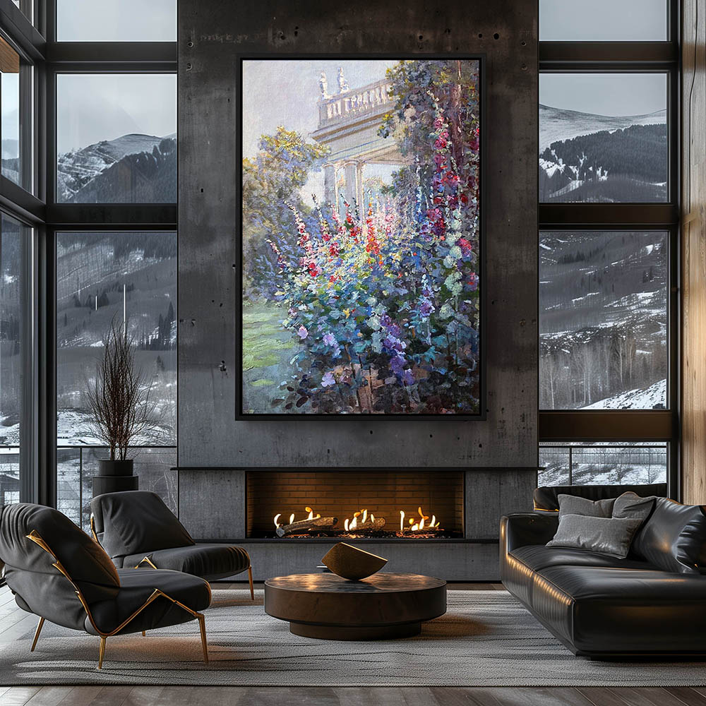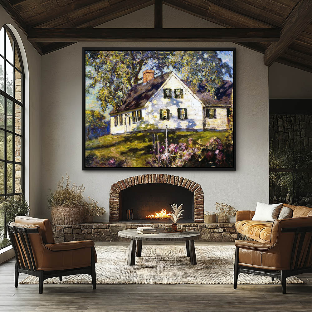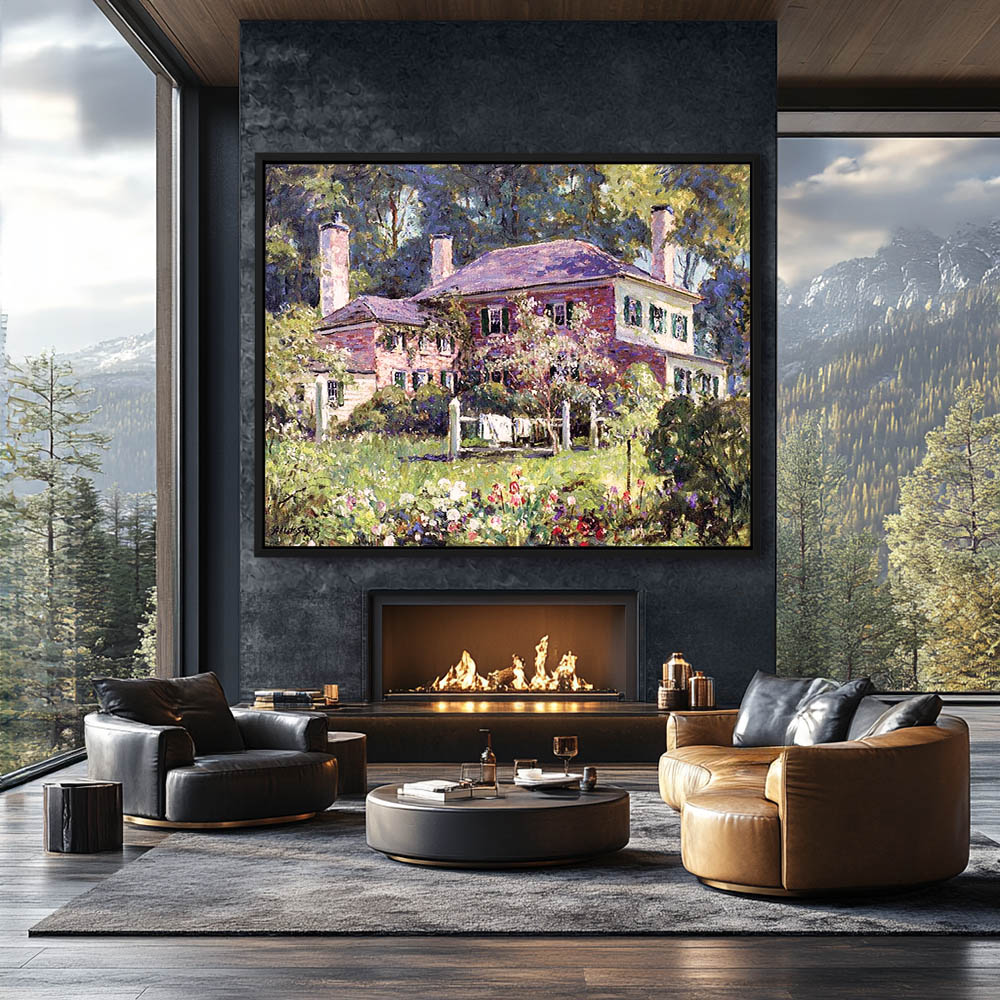 Vintage Landscape Painting with a House Overlooking the Flower Garden