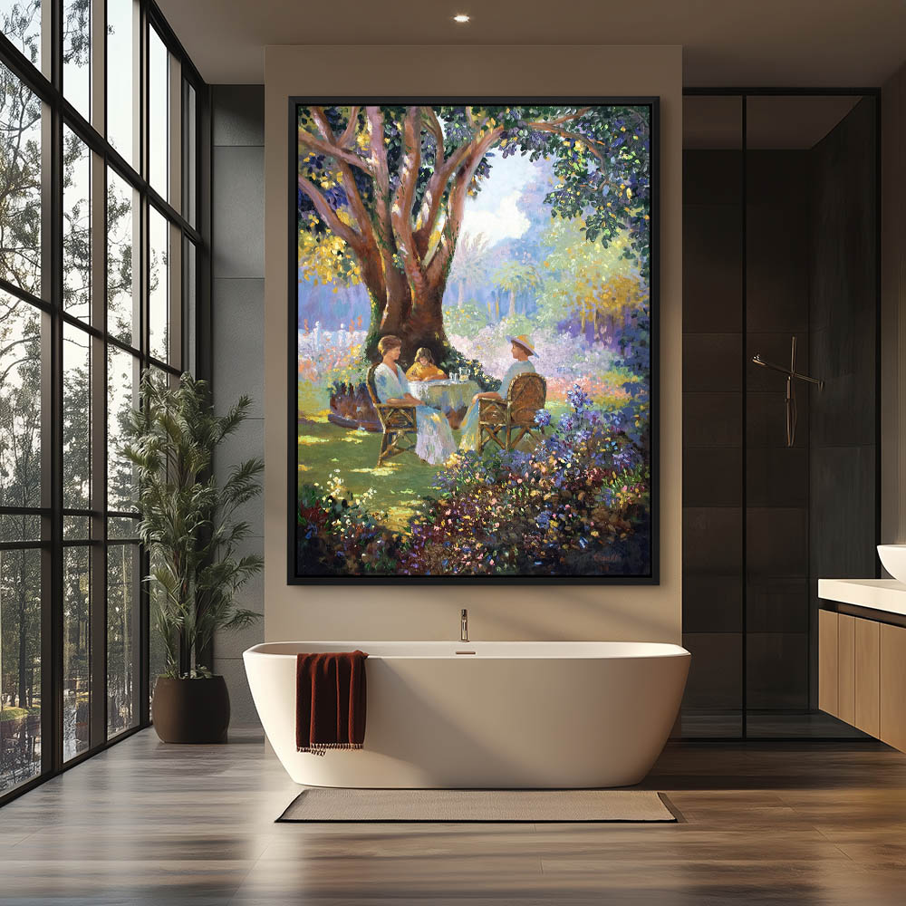 Vintage Landscape Painting with Ladies having Tea in the Garden Shade