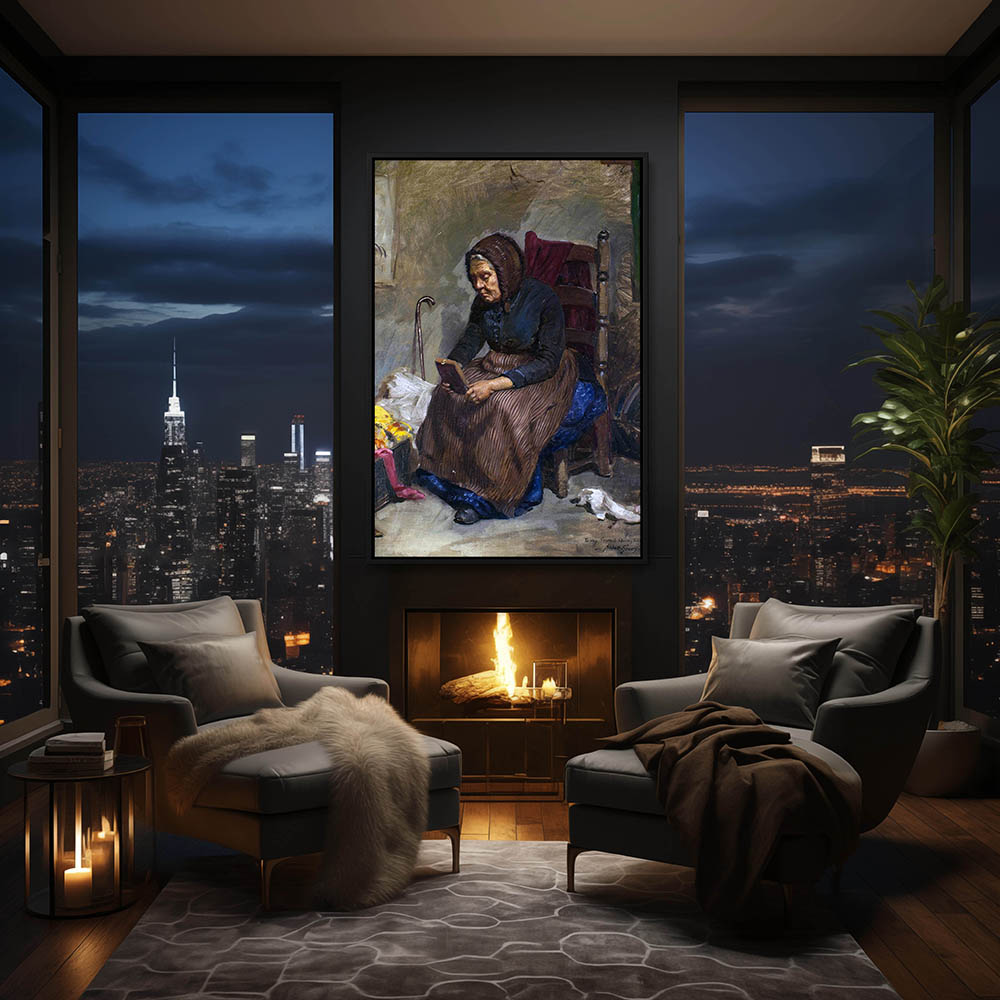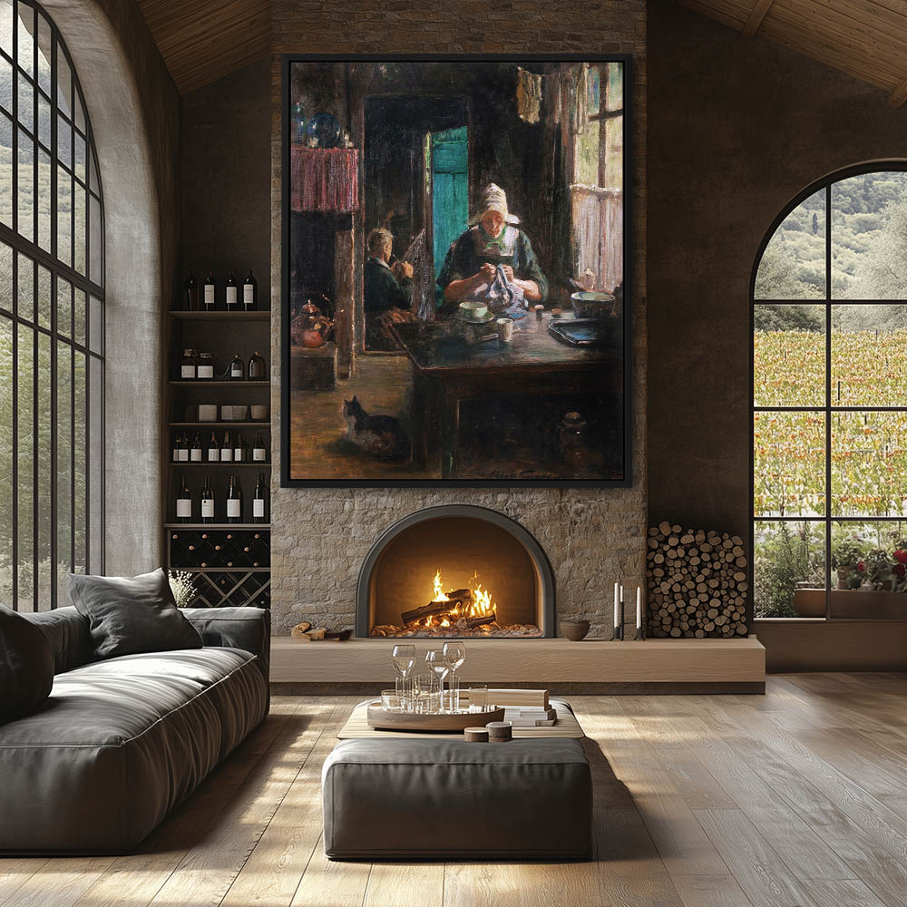 Vintage Figurative Painting with the Artist Grandmother Sewing at the Kitchen Table