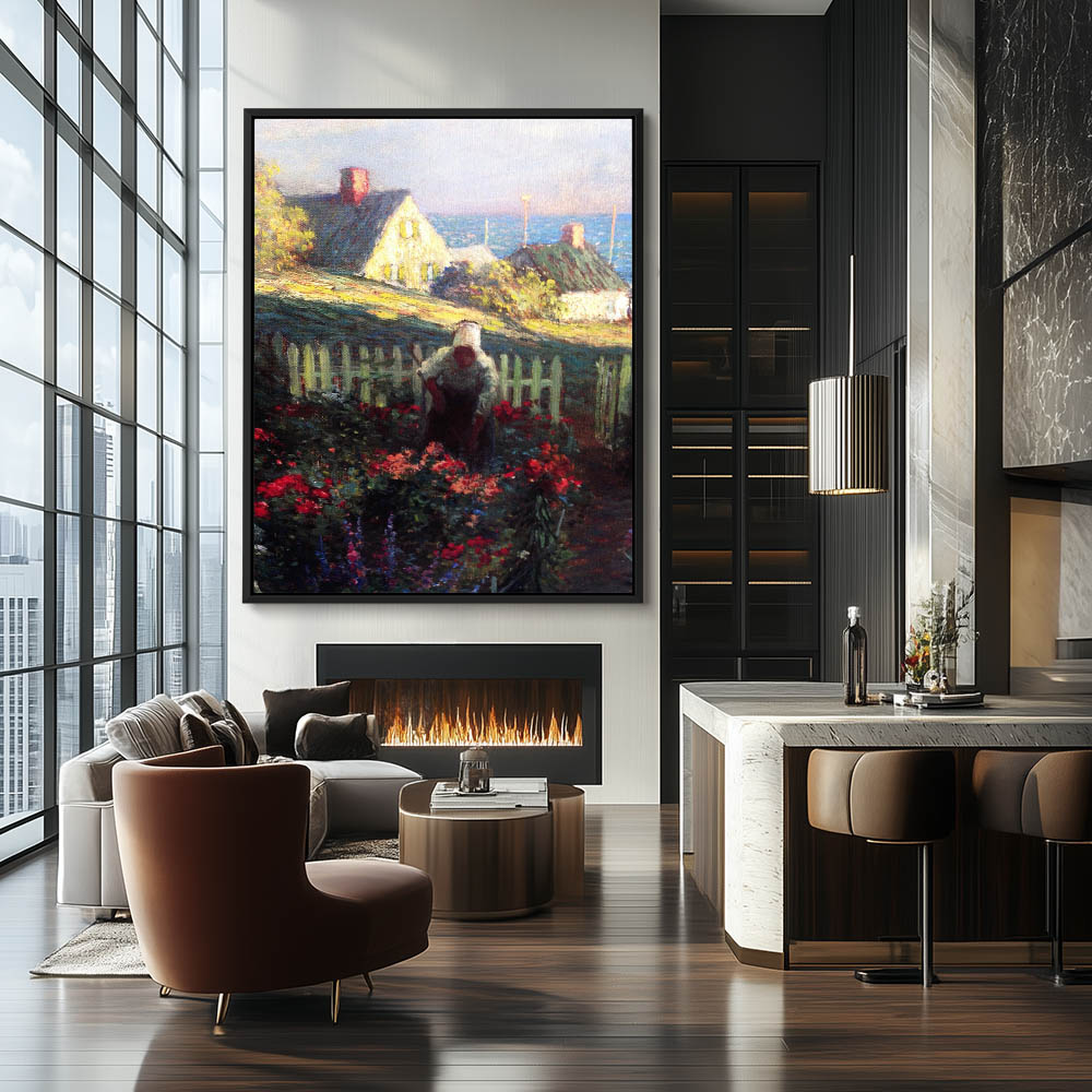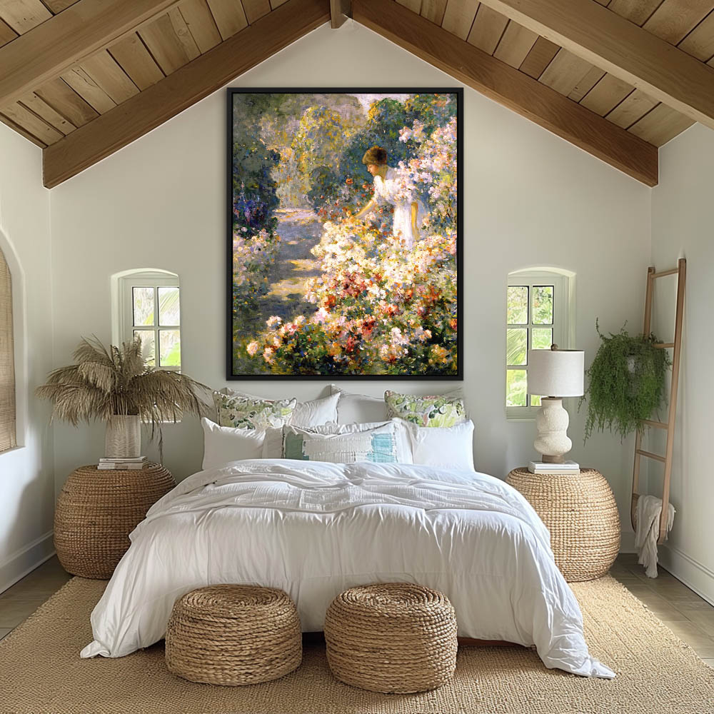 Vintage Landscape Flower Painting of a Woman in the Flower Garden in the Morning