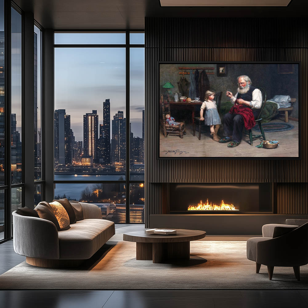 Vintage Figurative Painting with Grandpa Mending a Childs Dress