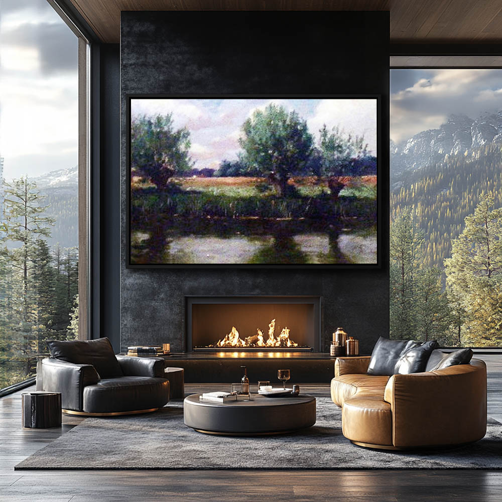 Vintage River Landscape Painting with a River and Trees on the Shore
