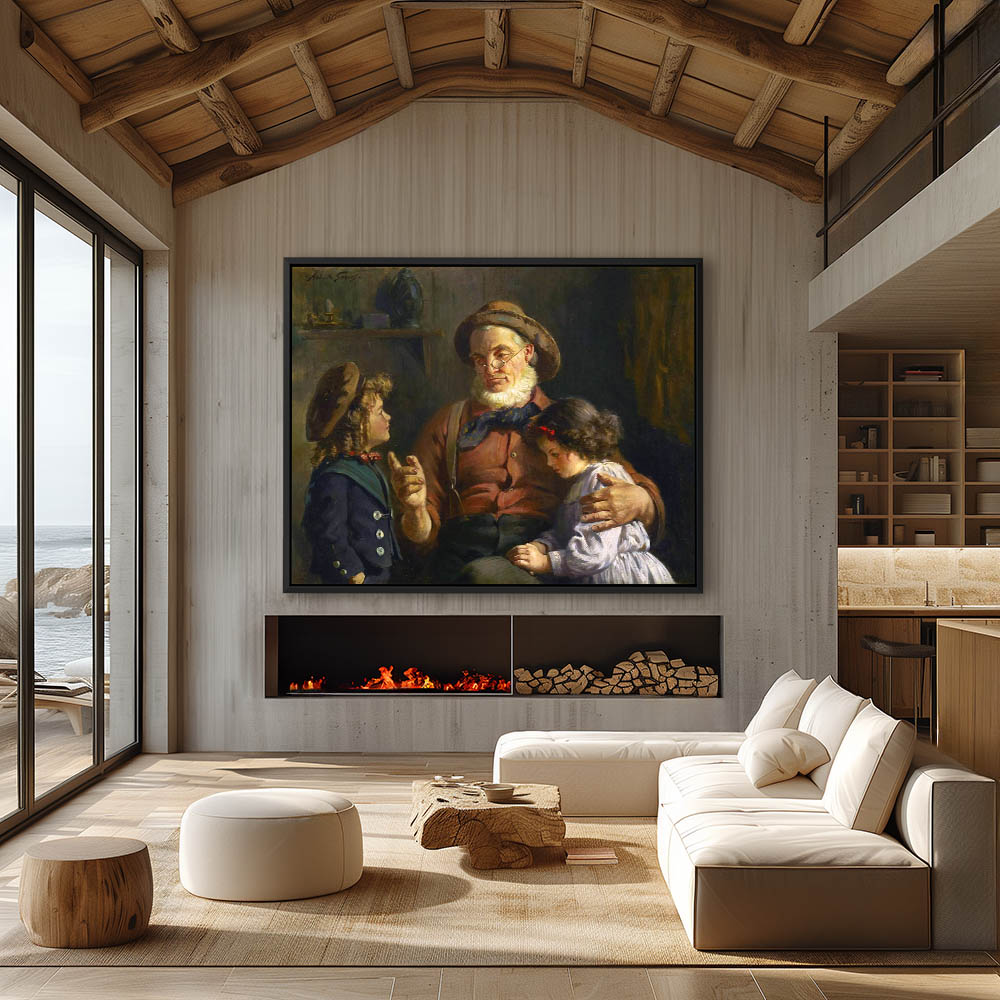 Vintage Figurative Painting of Grandpa Reading to the Children