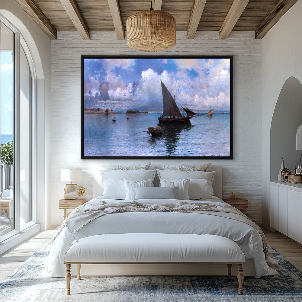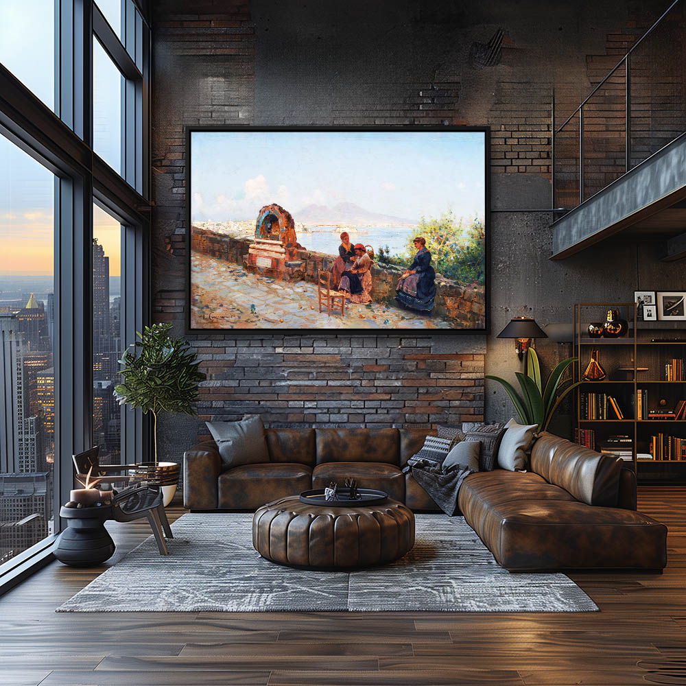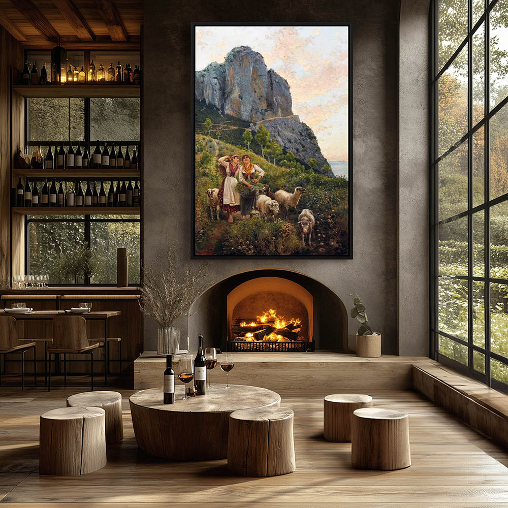 Painting of Two Female Figures with a Flock of Sheep on the Sea Shore Path