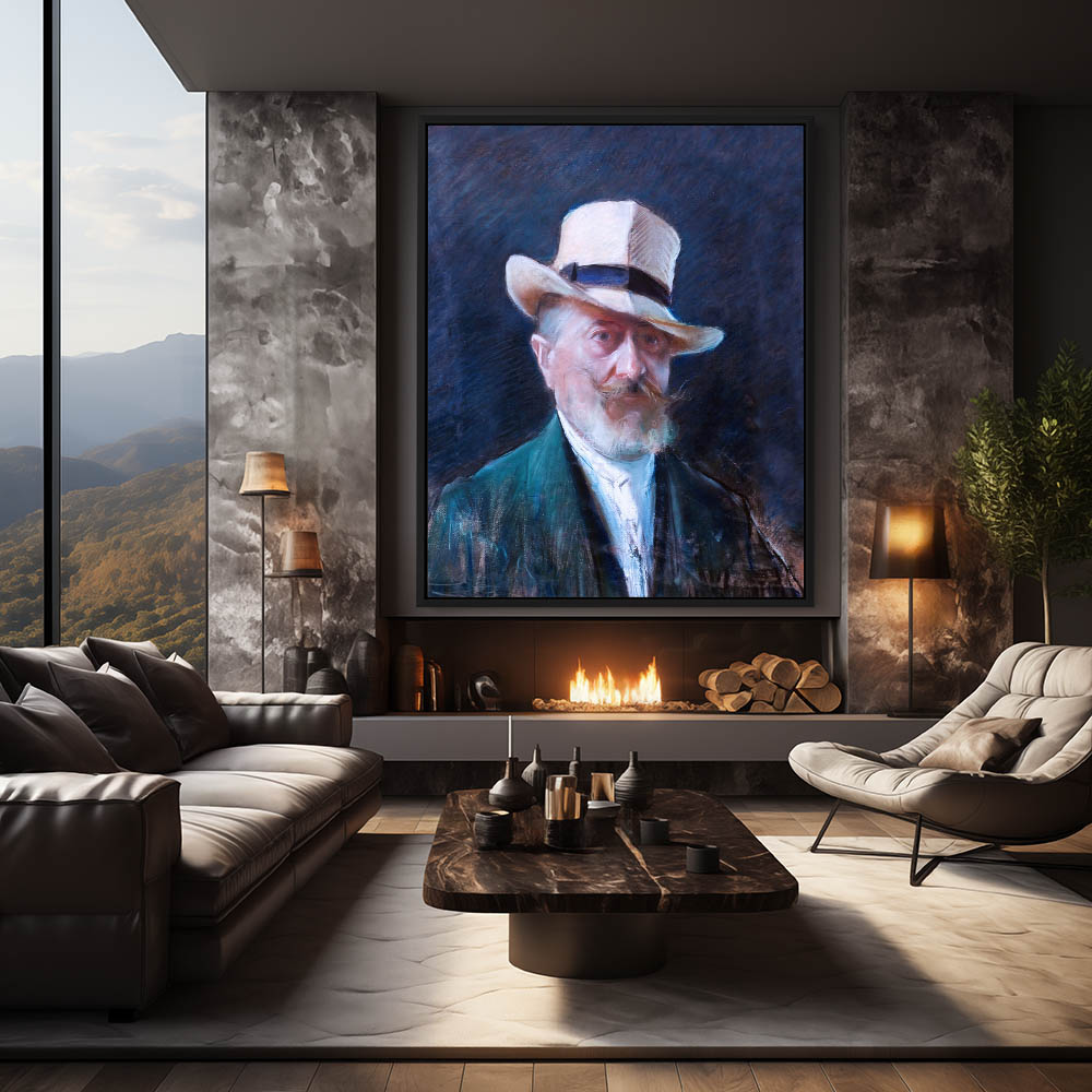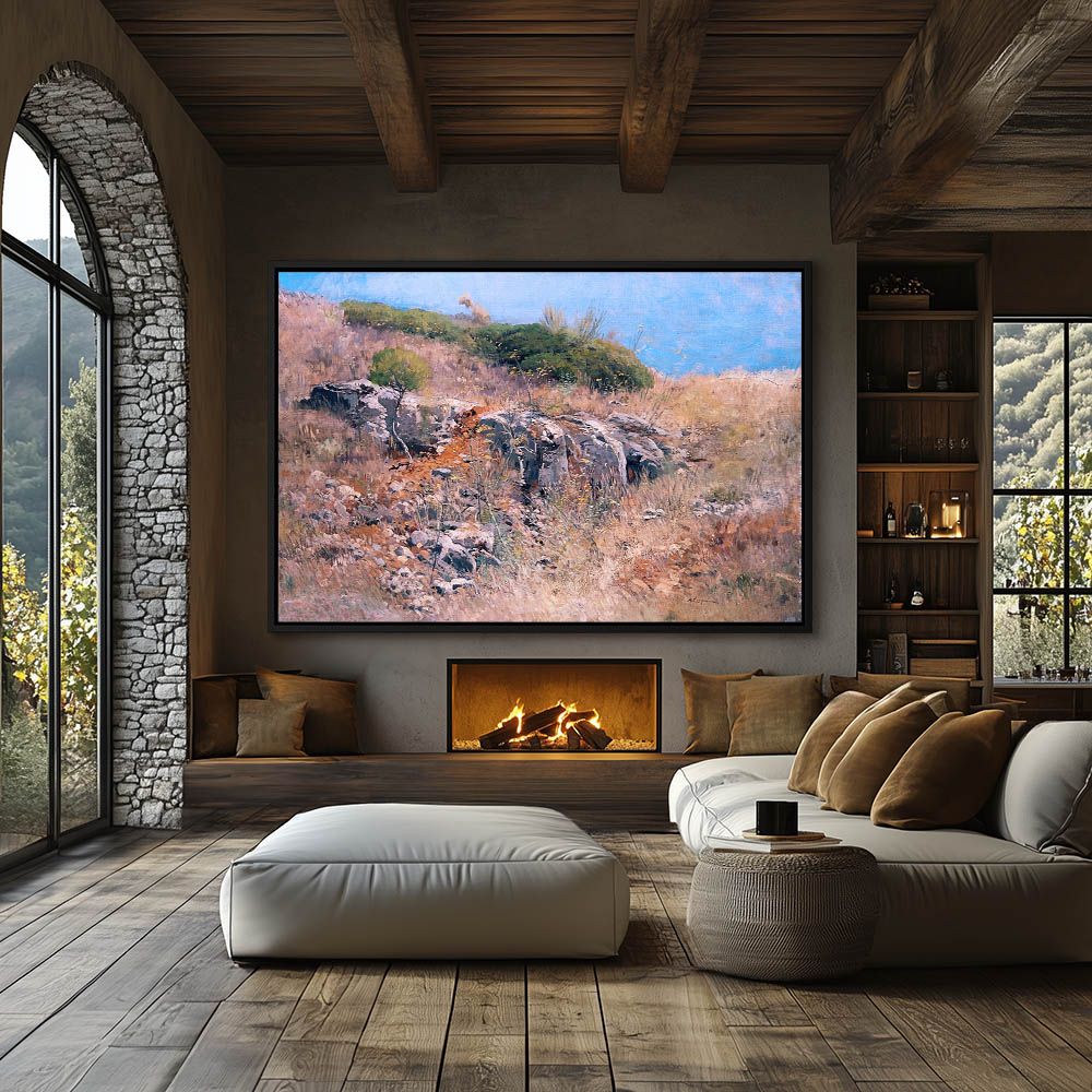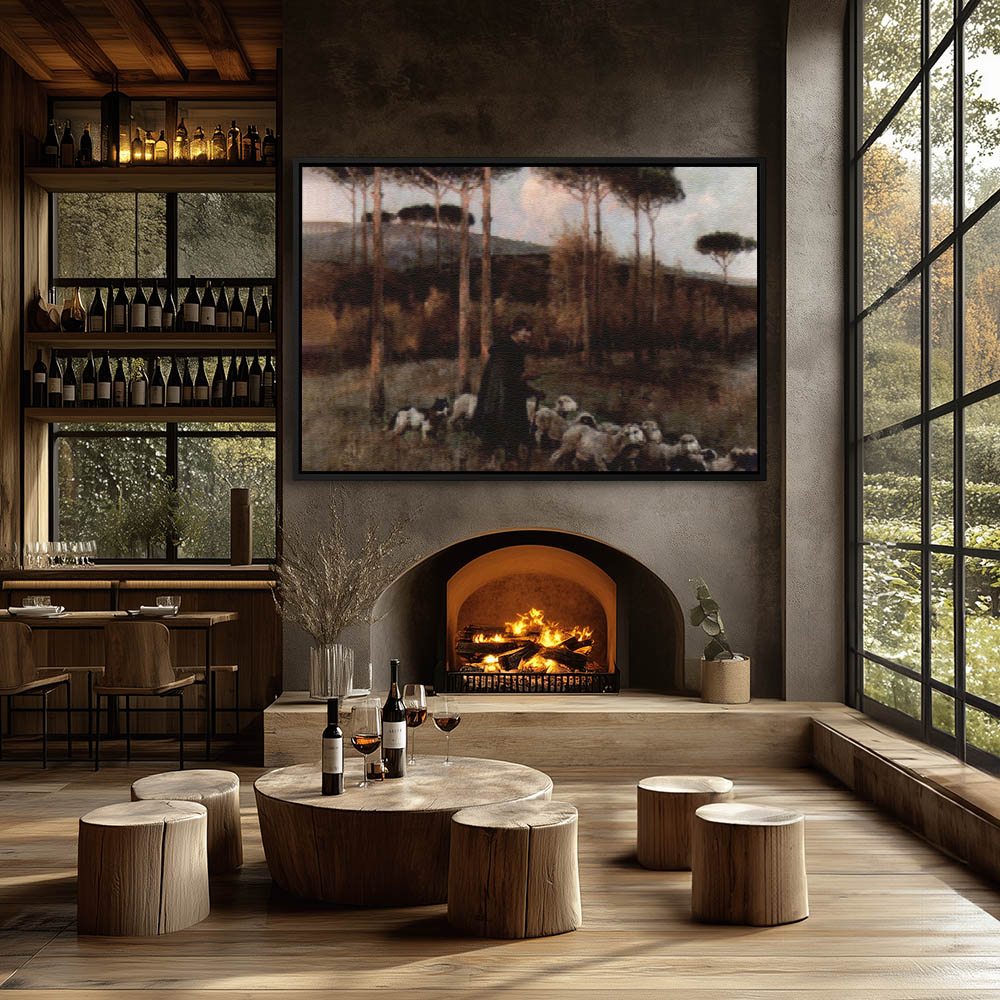 Vintage Painting of a Shepherd and Sheep in a Landscape at Sunset