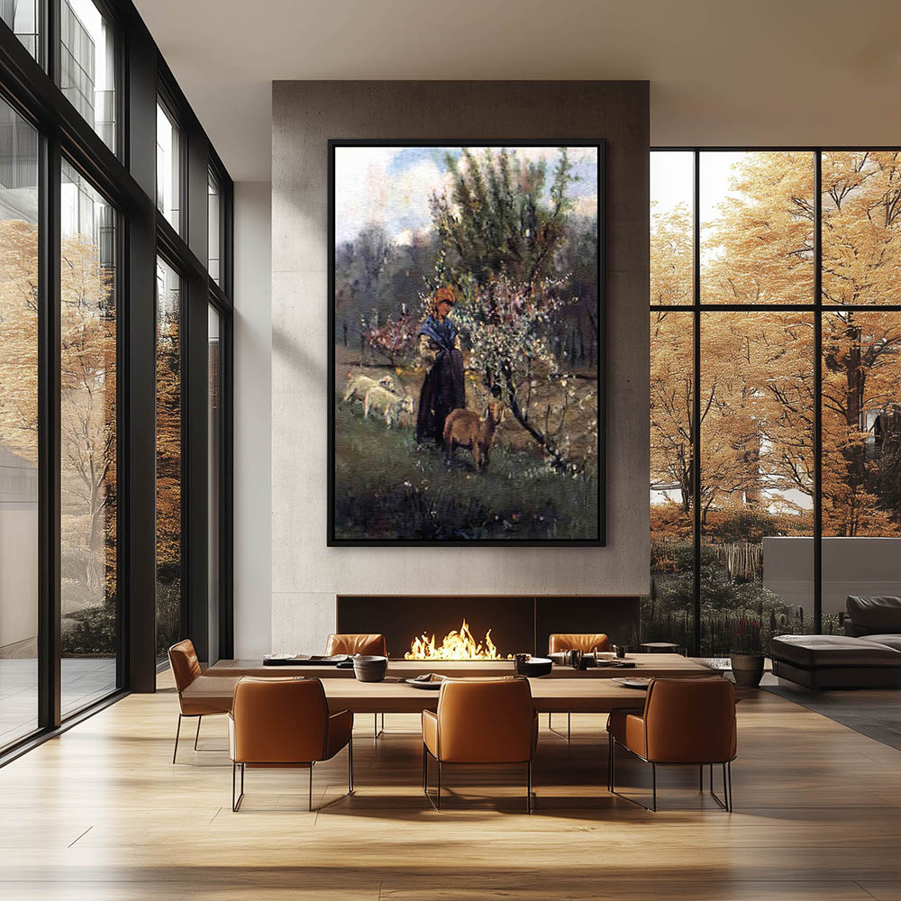 Vintage Painting with a Shepherdess on a Farm with Sheep