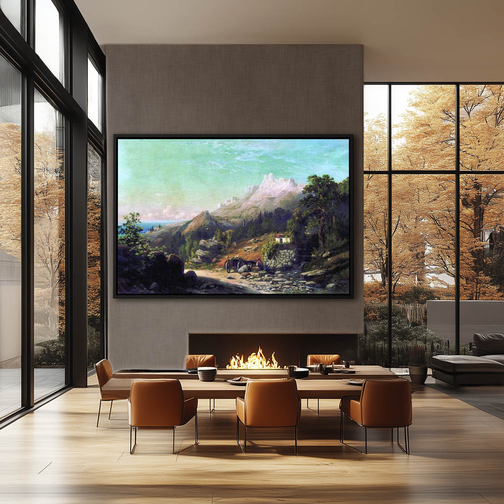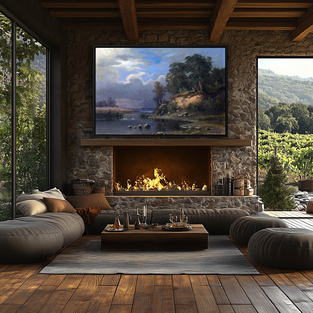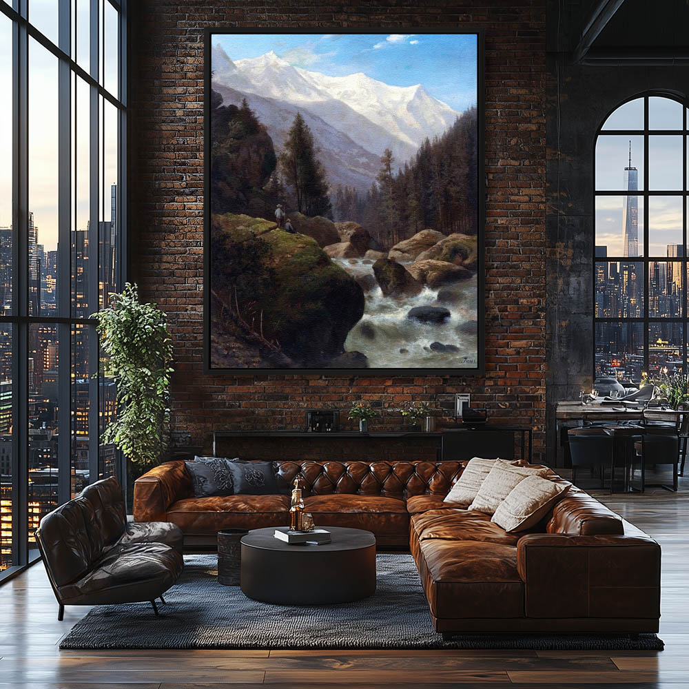 Mountain Landscape Painting with River Trees Large Rocks and Two Figures