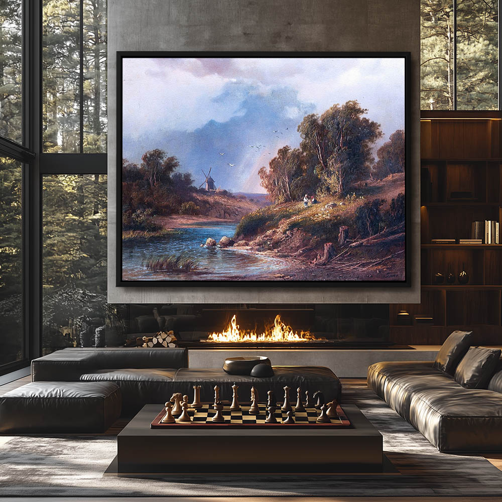Landscape Painting with Windmill and River