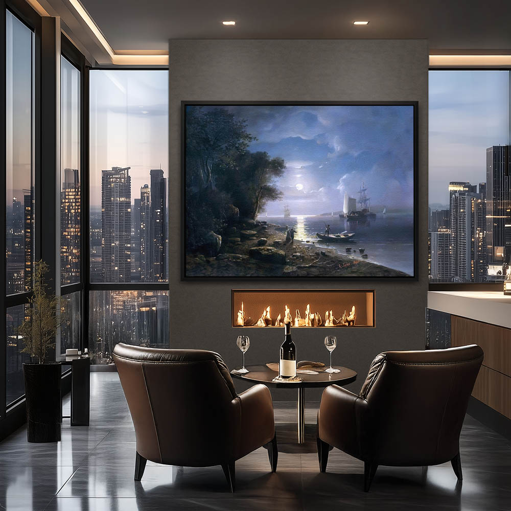 Coastal Painting Under Moonlight with Figures Boats and the Sea