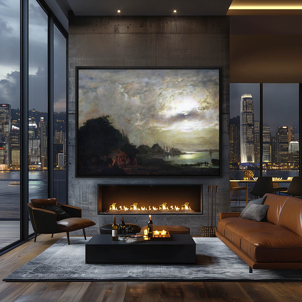 Landscape Painting at Night under Moonlight with Campfire