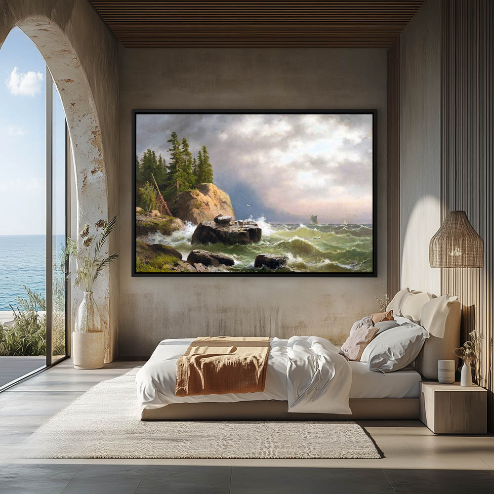 Coastal Painting with Sailboats and Big Waves and Rocks on the Shore