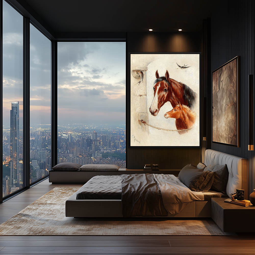 Horse and foal and birds with a nest and chicks