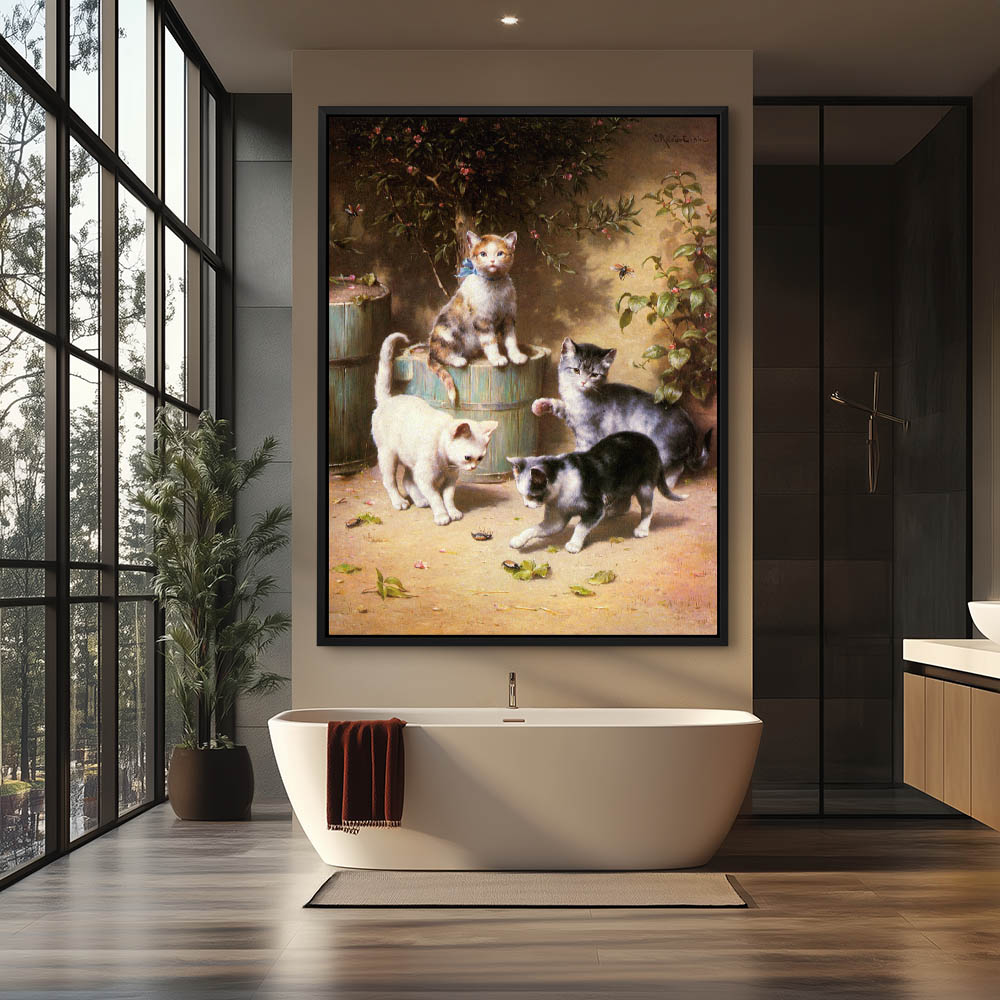 Four kittens in a flower garden playing with beetles