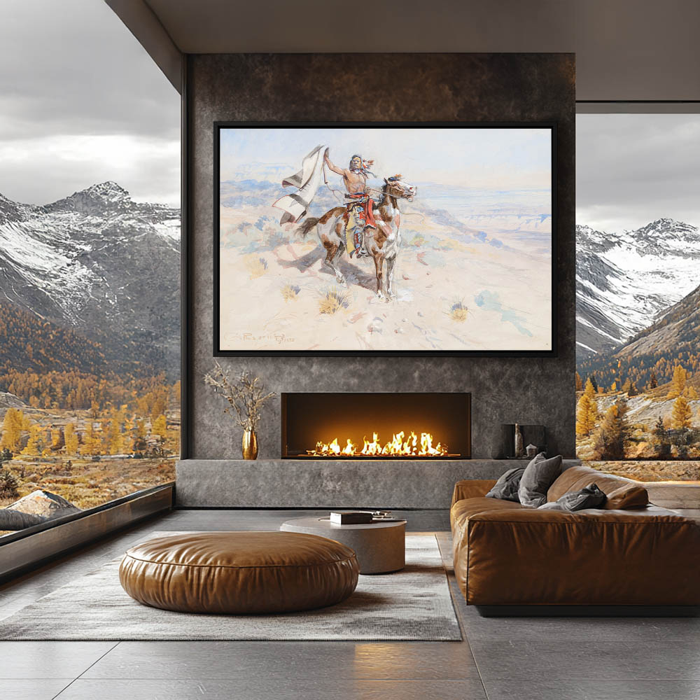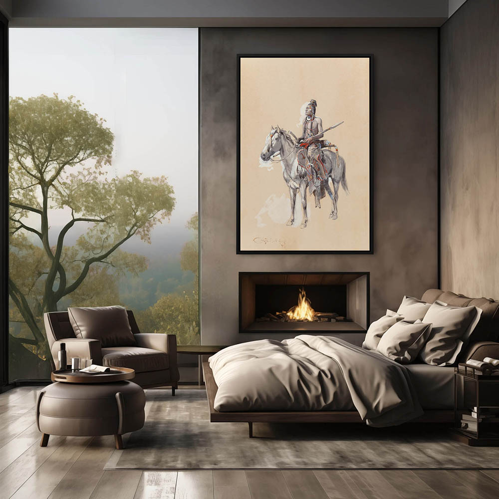 From $29.97Indian crouched on the bank by a canoe watching someone come across the lake while someone tends the camp fire in the forest behind him