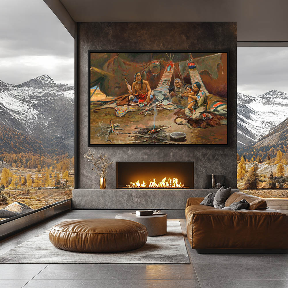Indian family in their teepee sitting around the fire smoking a pipe and playing with a child