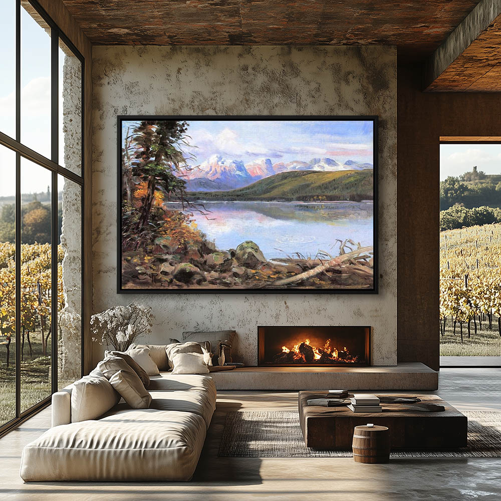 Landscape view across a lake to the rolling hills and mountains on the far side