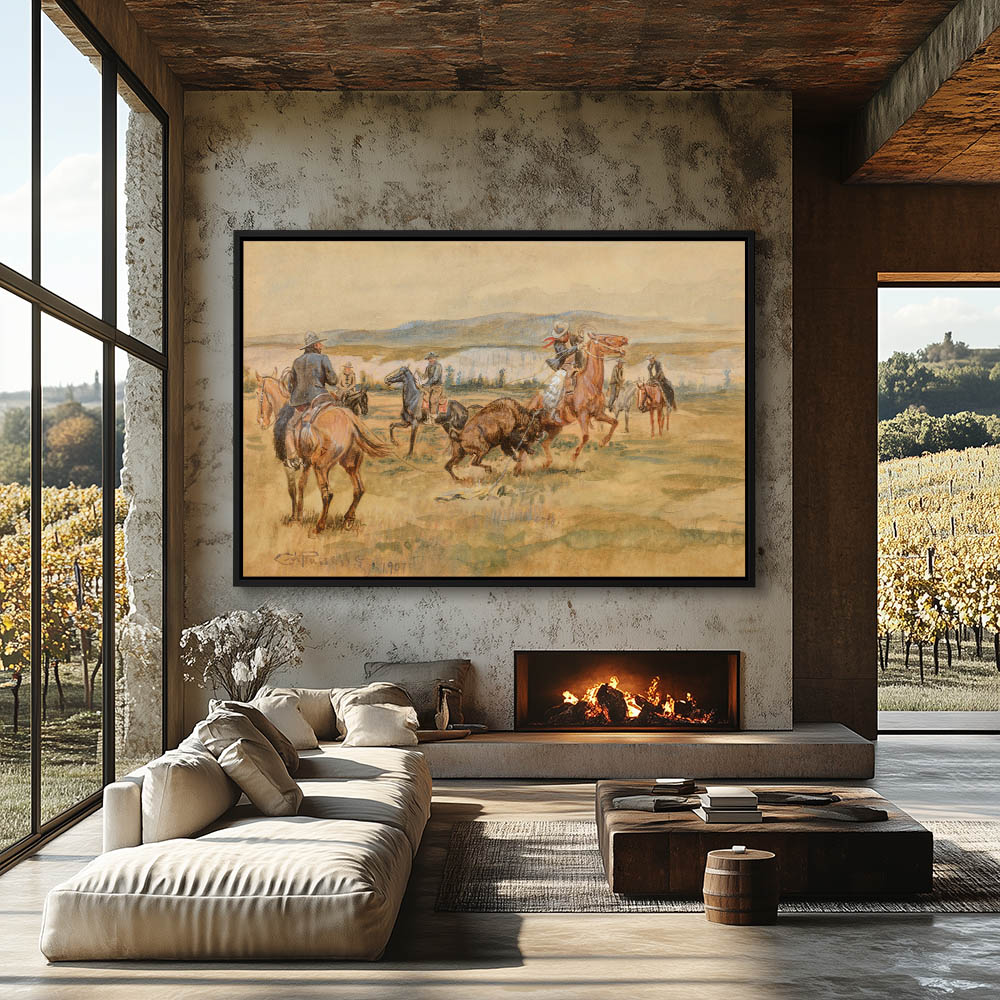 Group of men wrangling a buffalo in one of the last buffalo roundups