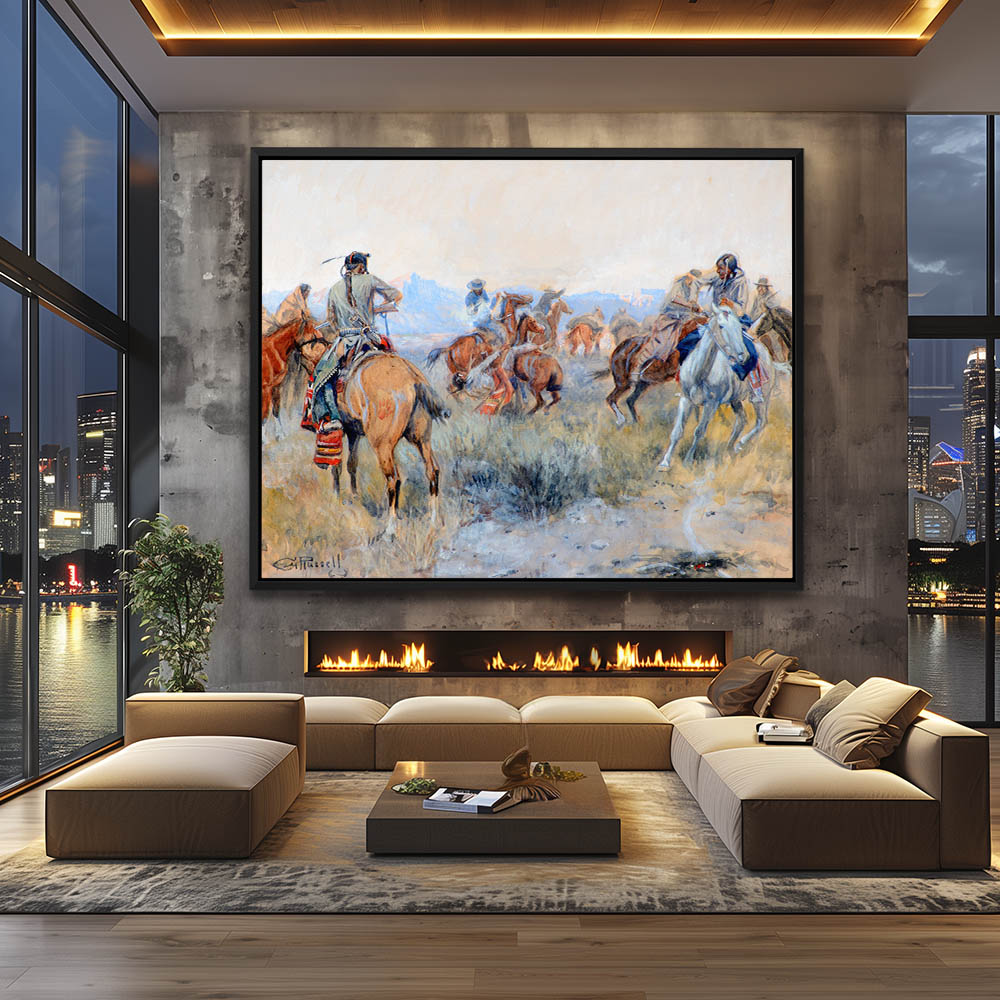 Interior of a teepee with an Indian family admiring the rabbit killed by a small boy