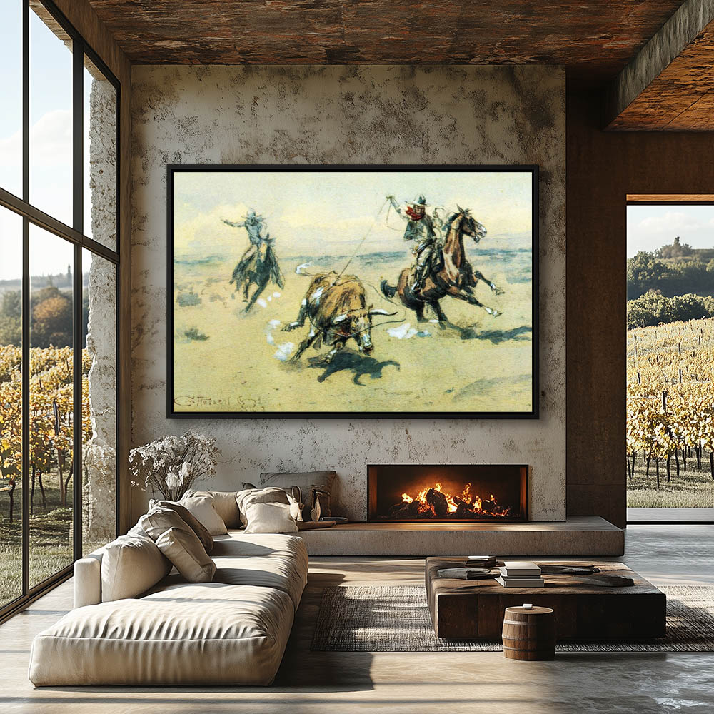 Cowboys chasing and roping a steer