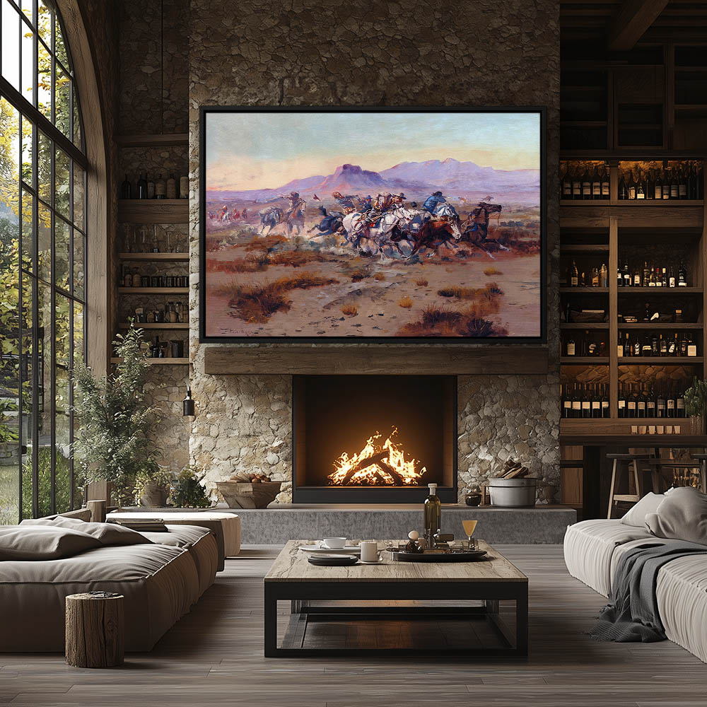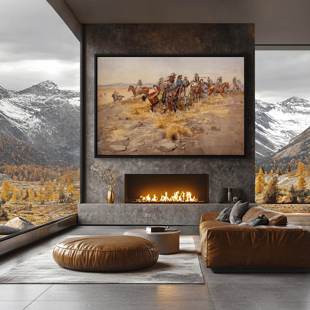 Cowboys on horseback scattering to ride off in a hurry