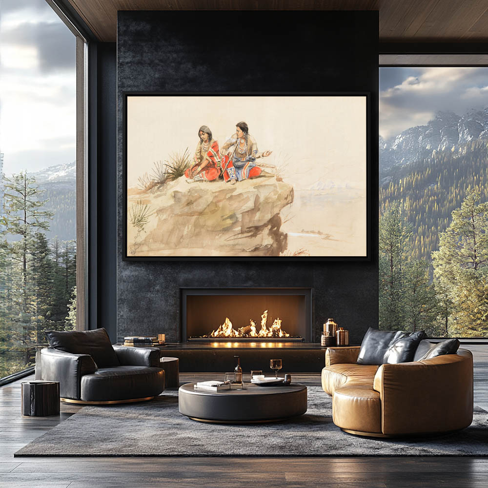 Indian on a hilltop signaling to others in the distance with the wave of a blanket