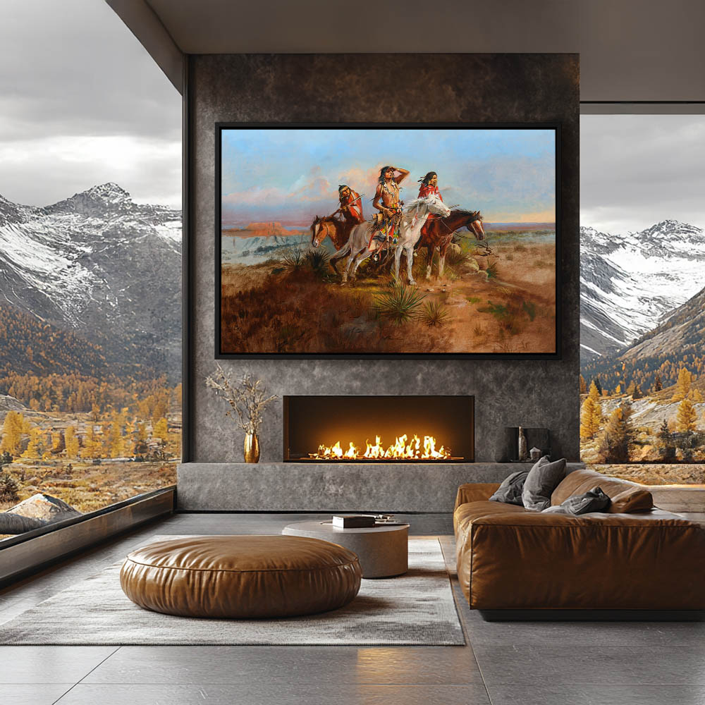 Indians on horseback on a ridge looking into the distance