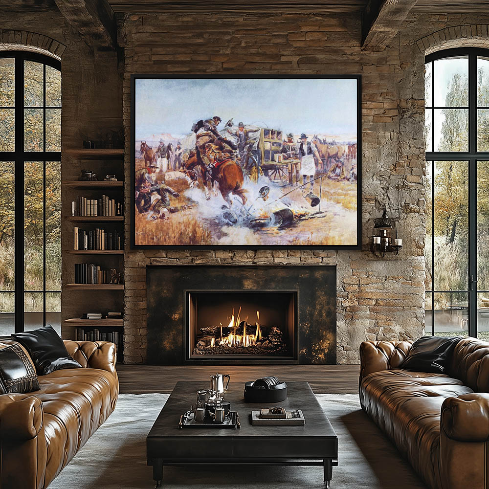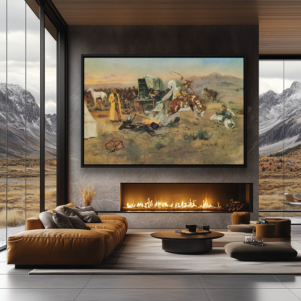Bucking horse tearing through wagon train camp
