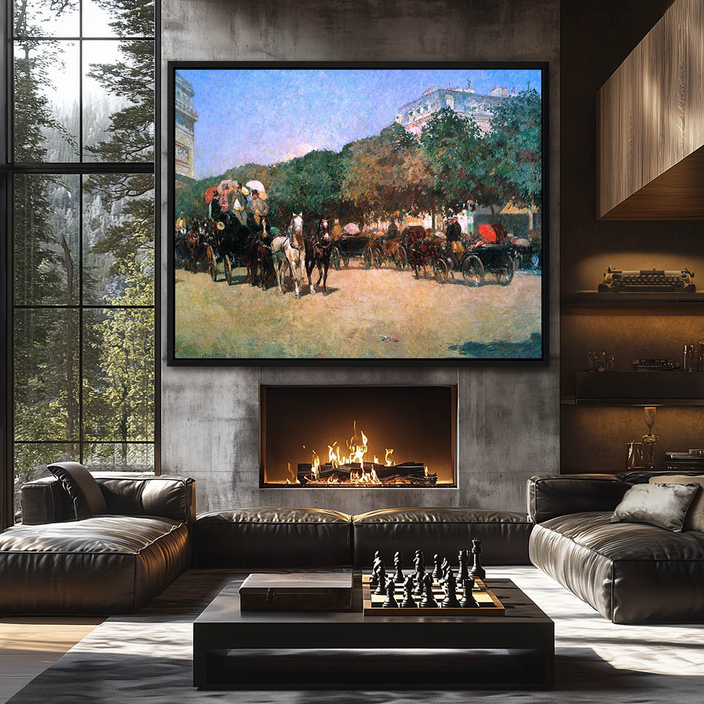 Horse drawn cabs waiting along the sidewalk as people pass by