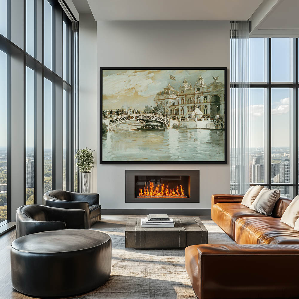Large riverfront building with an arched footbridge