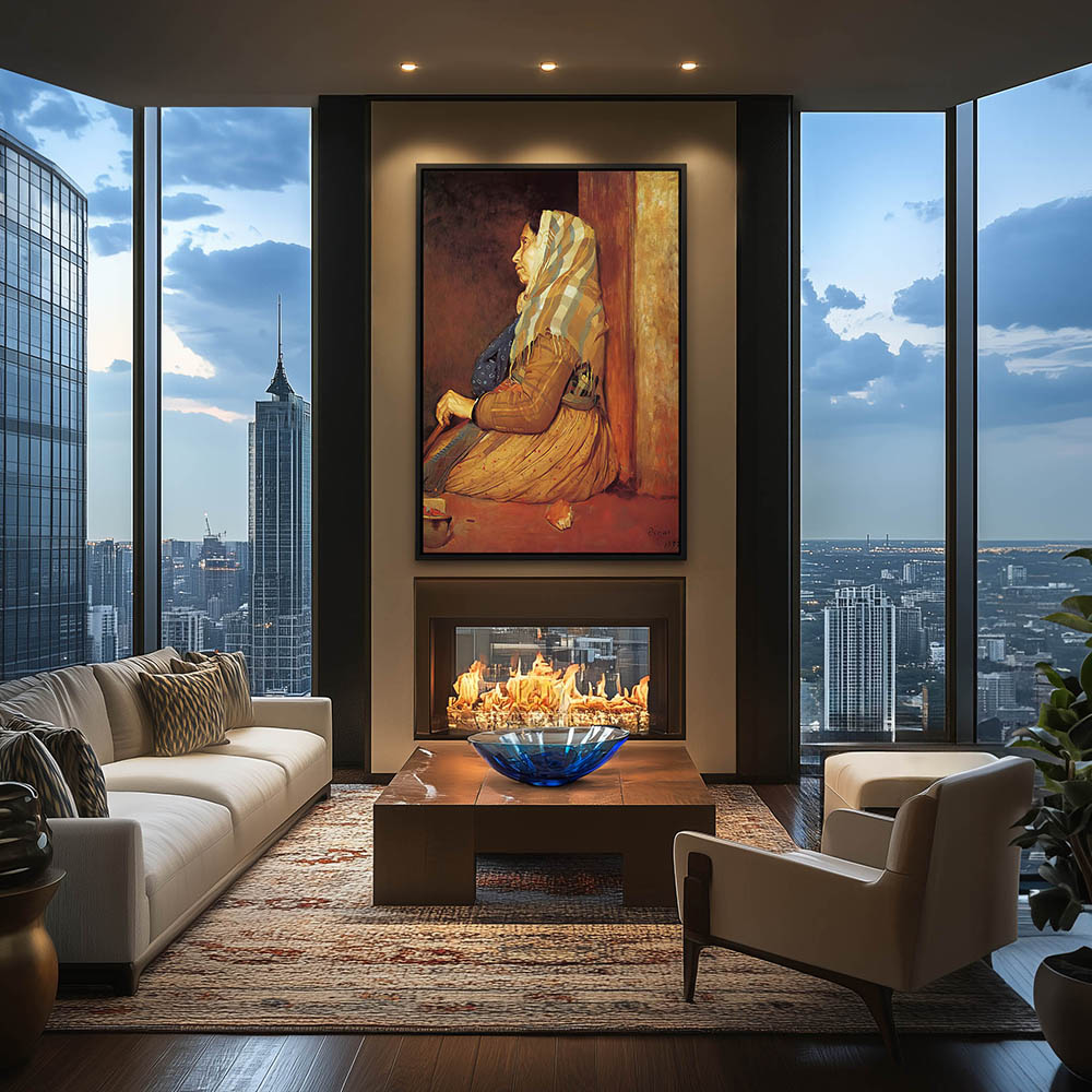 Older woman with walking stick, headscarf and apron sitting next to half eaten bread and a broken cup