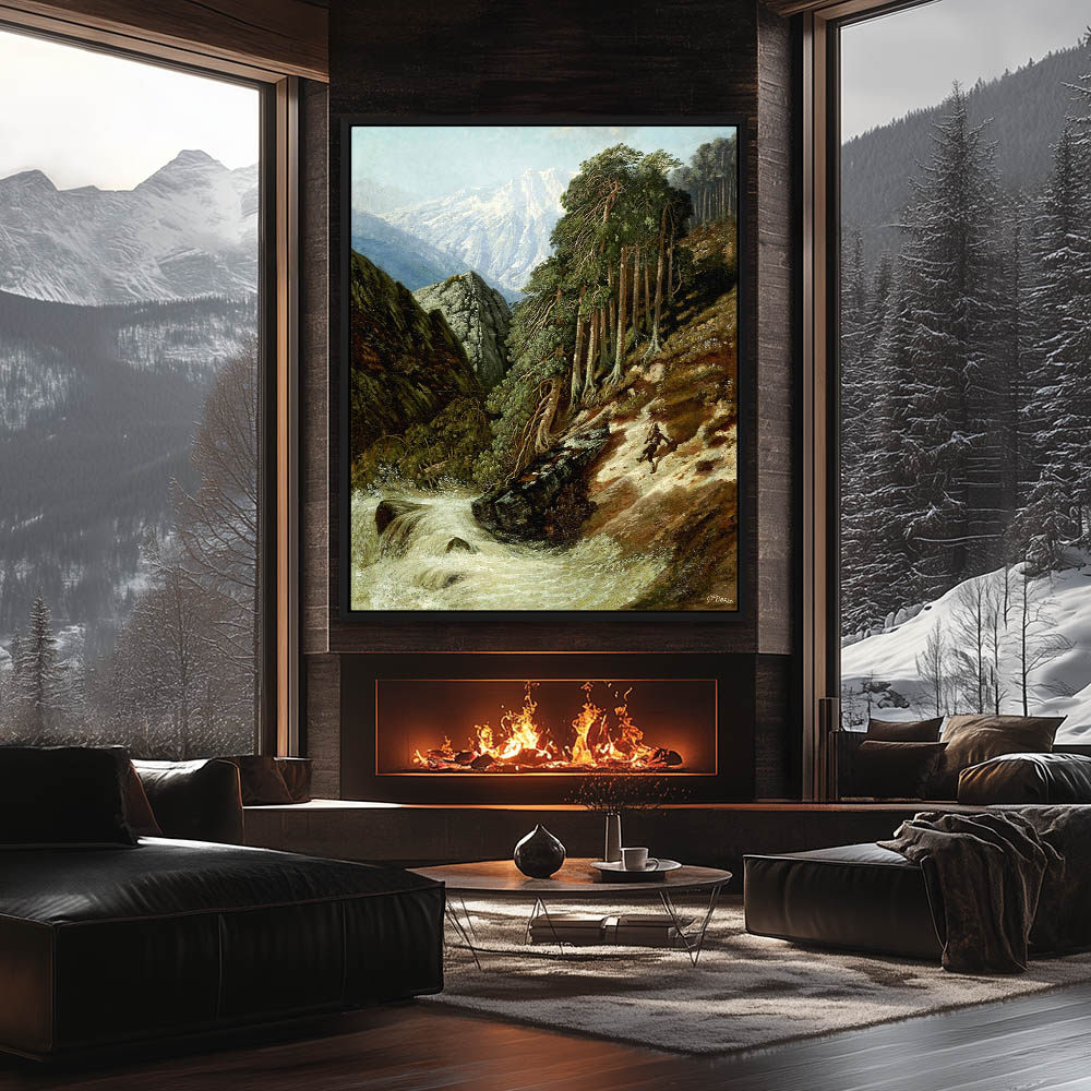 Figure traversing the steep mountain landscape above a raging river