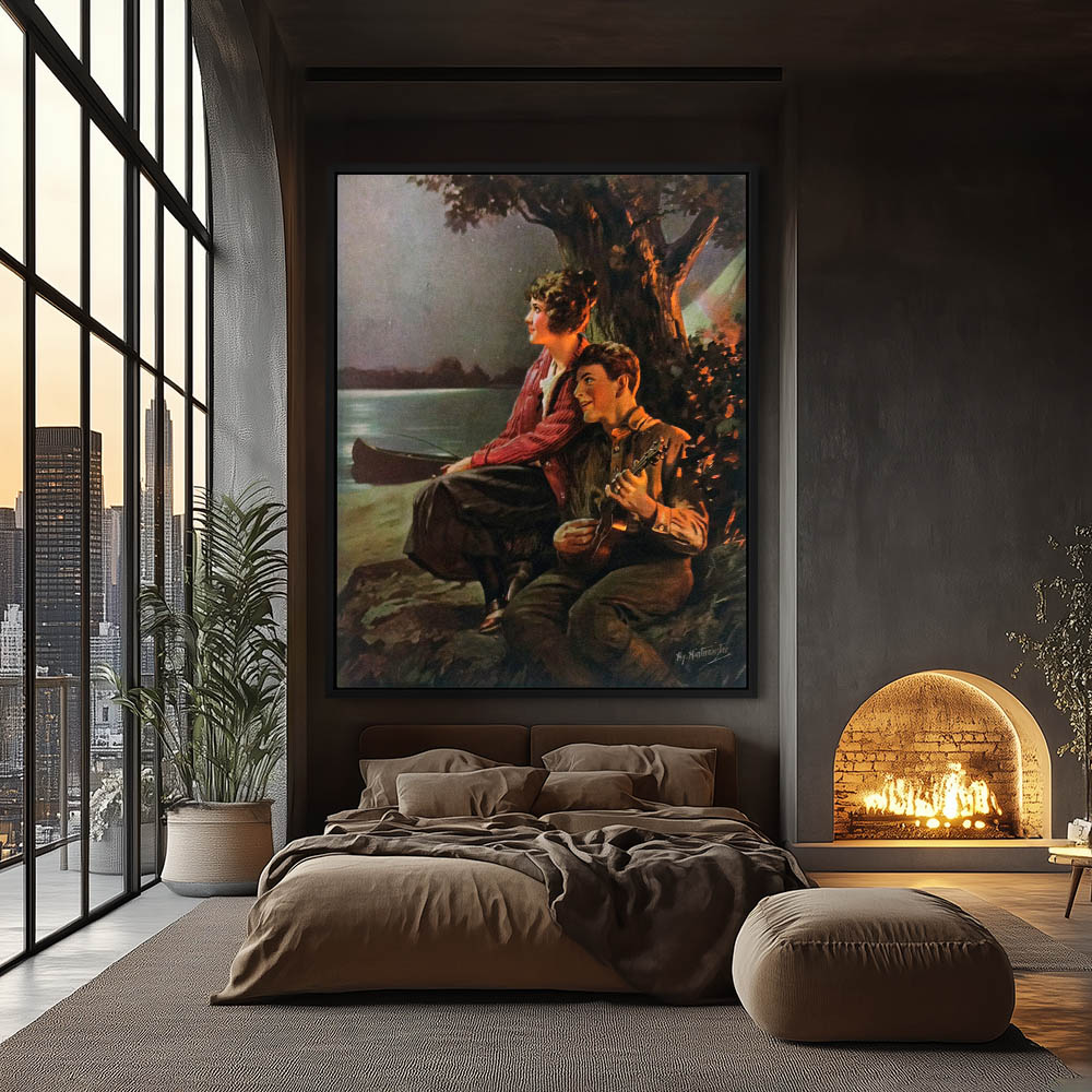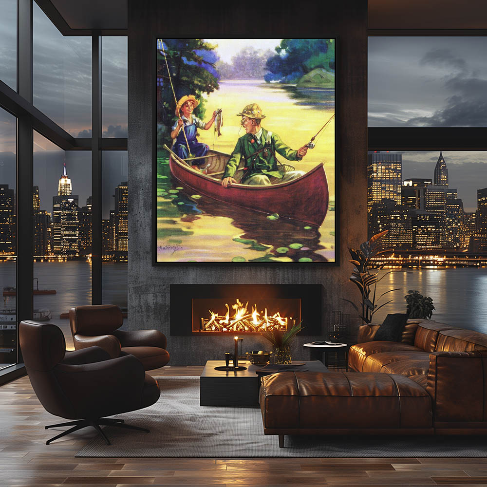 Figurative Painting of Grandpa and Child on a Boat with a Puppy