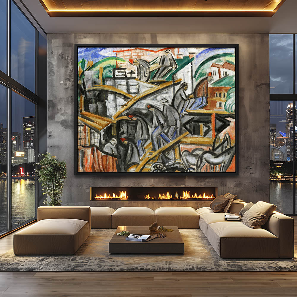 Vintage Abstract Industrial Painting with Construction Workers
