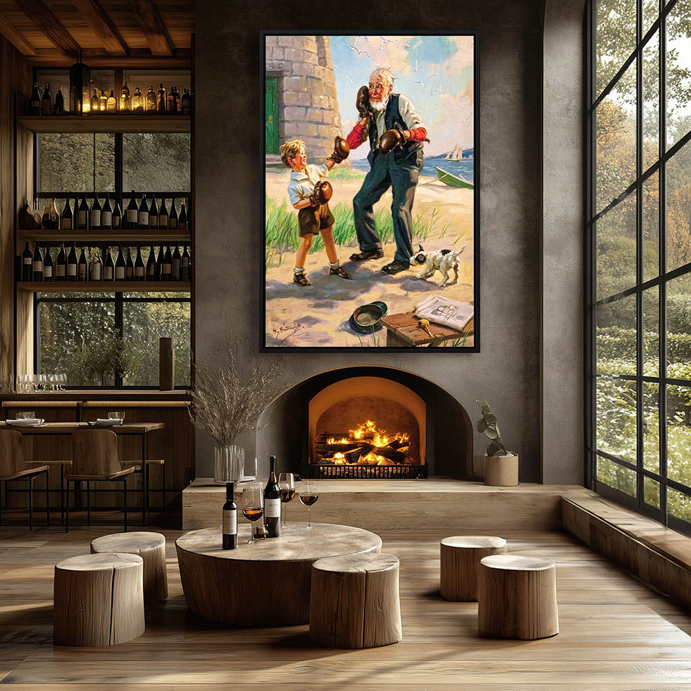 Figurative Painting of Grandpa Boxing with a Child and Dog