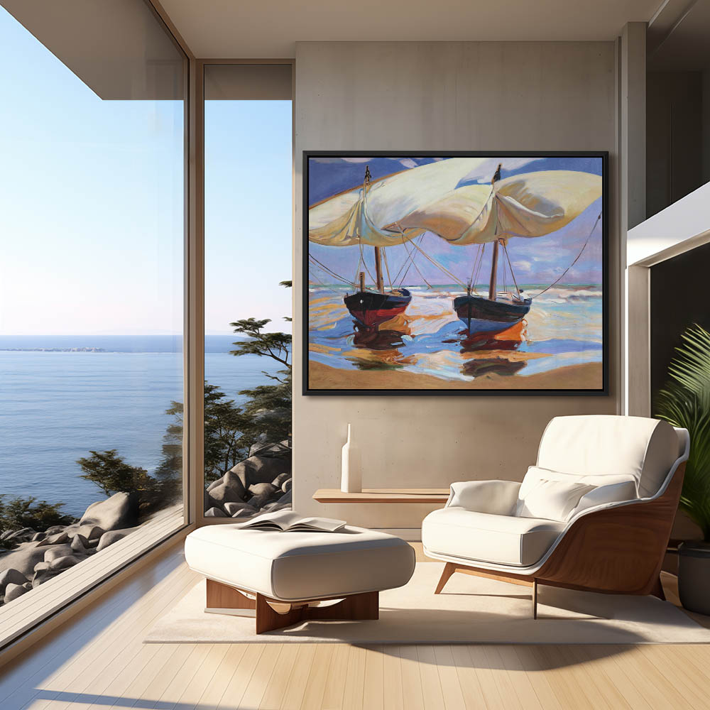 Vintage Seascape Painting with Sailboats at Sea under the Moonlight