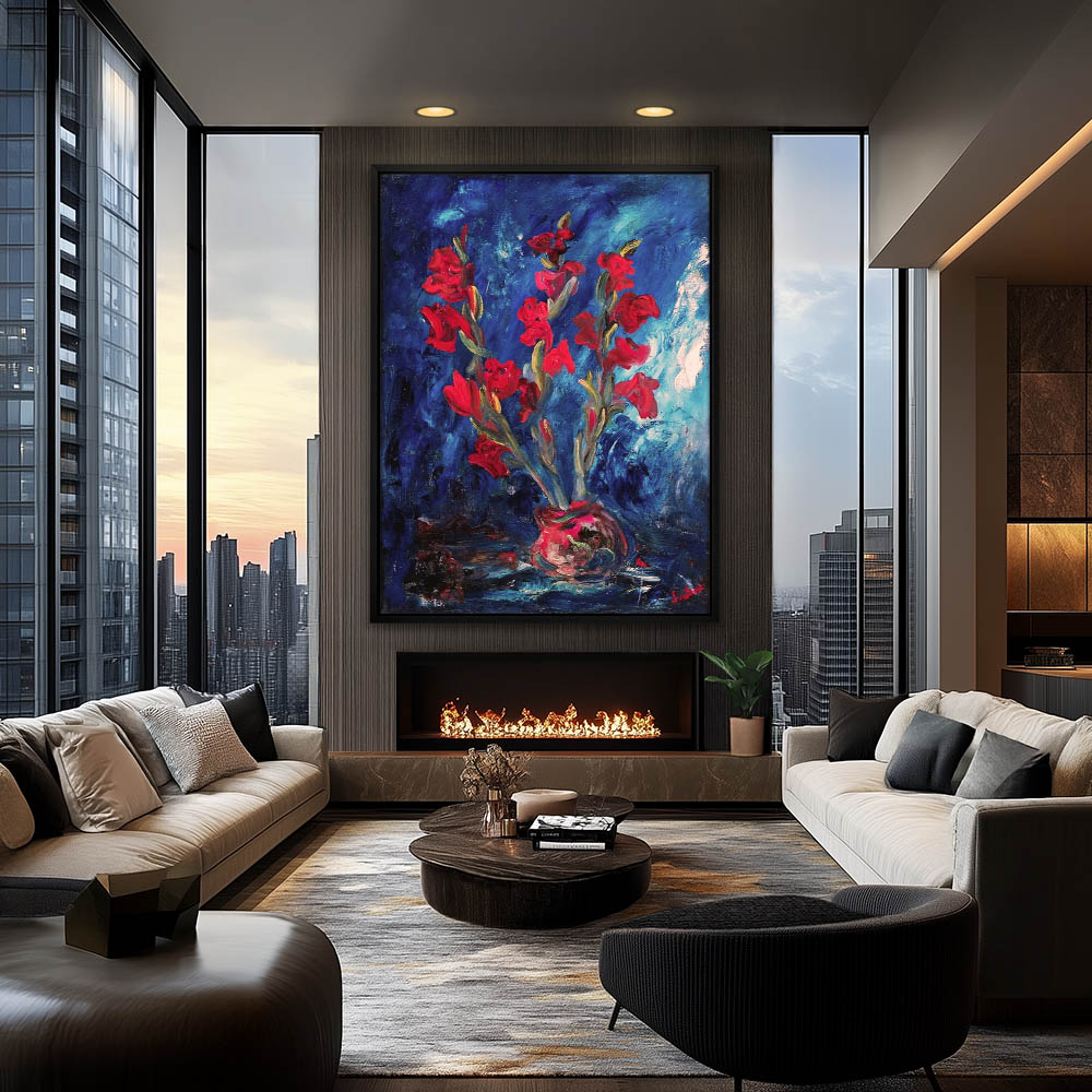 Abstract Still Life with a Bouquet of Red Gladioli Flowers