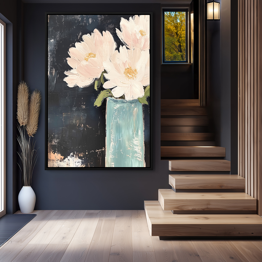 Flower wall decor paintings look stunning as part of bedroom or bathroom wall decor. These paintings are available in a wide range of sizes and formats, including metal prints, metal wall art, fine art prints, framed prints, vinyl wall art, vinyl peel and stick, poster art, stretched canvas, and framed canvas wall art. The framed options come with floater frames in black, brown, or white.