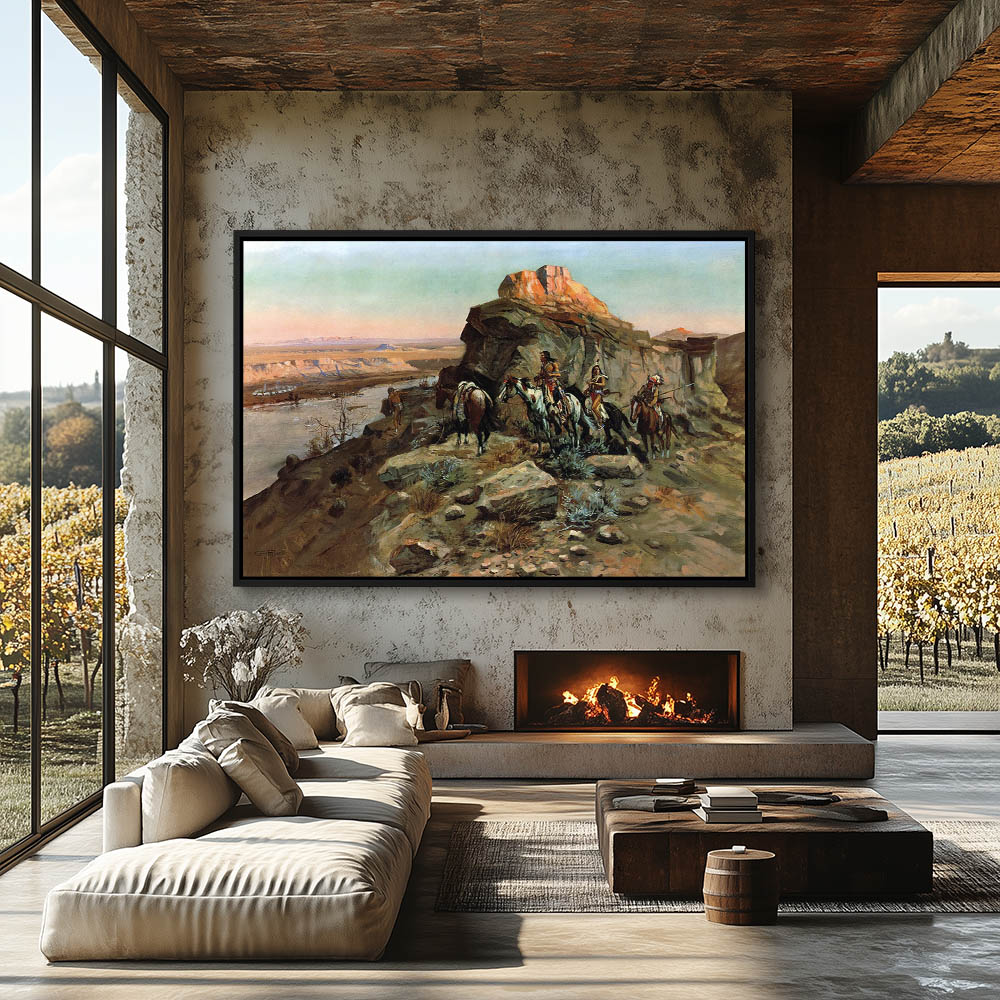 Indians on horseback spying on a wagon train in the distance