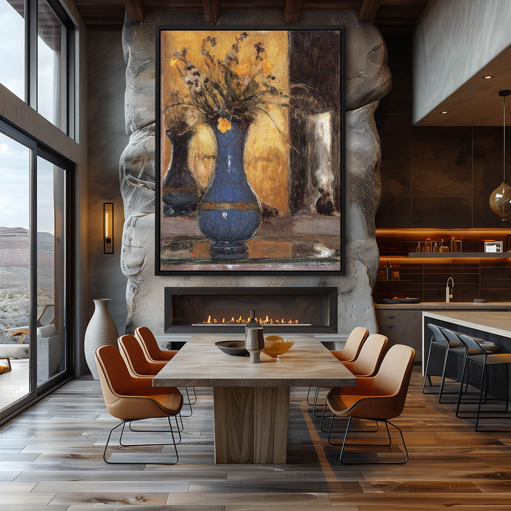 Abstract Still Life Painting with Flowers and Fruit in Blue Vase and Bowl