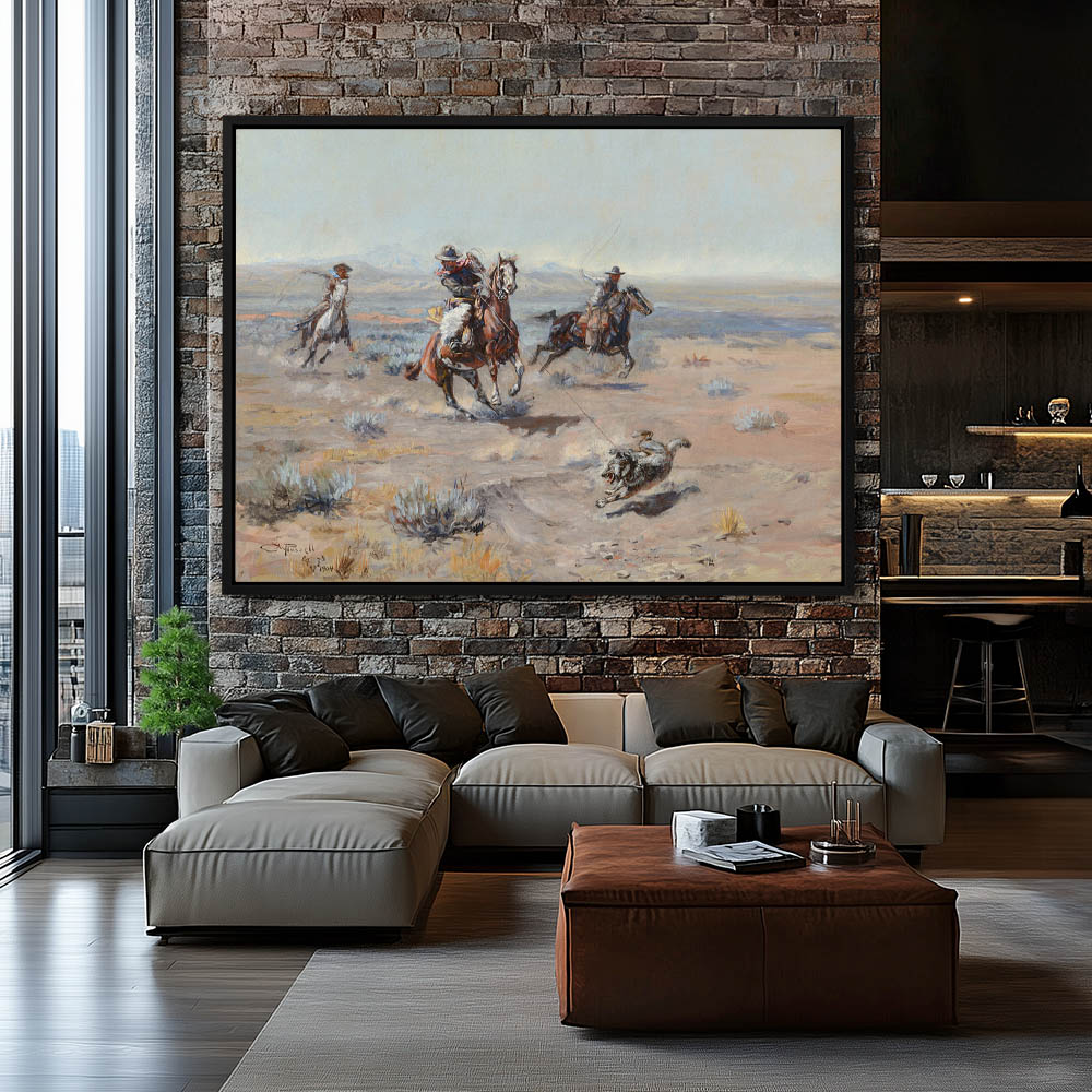 Cowboys on horseback roping a wolf